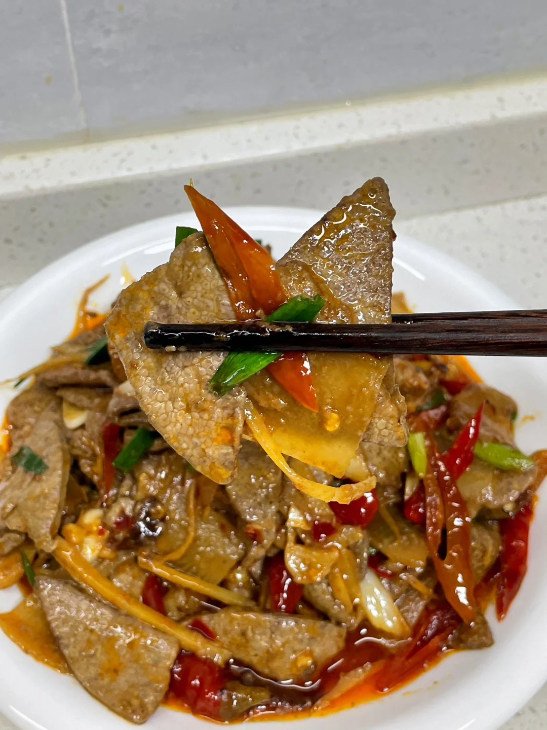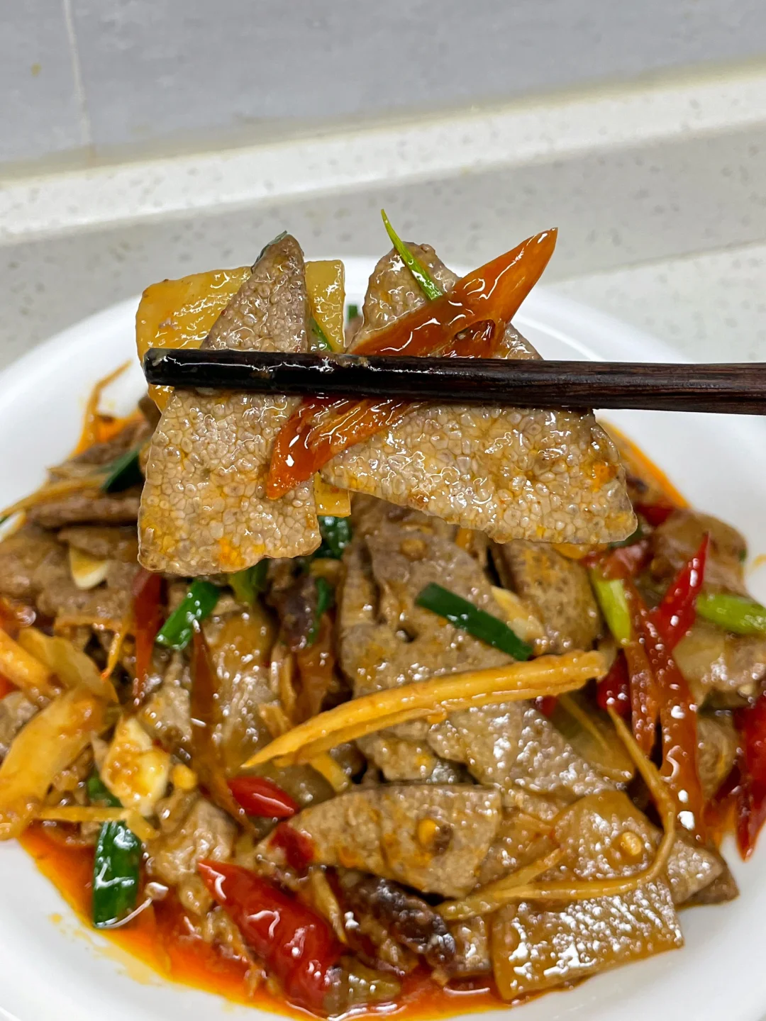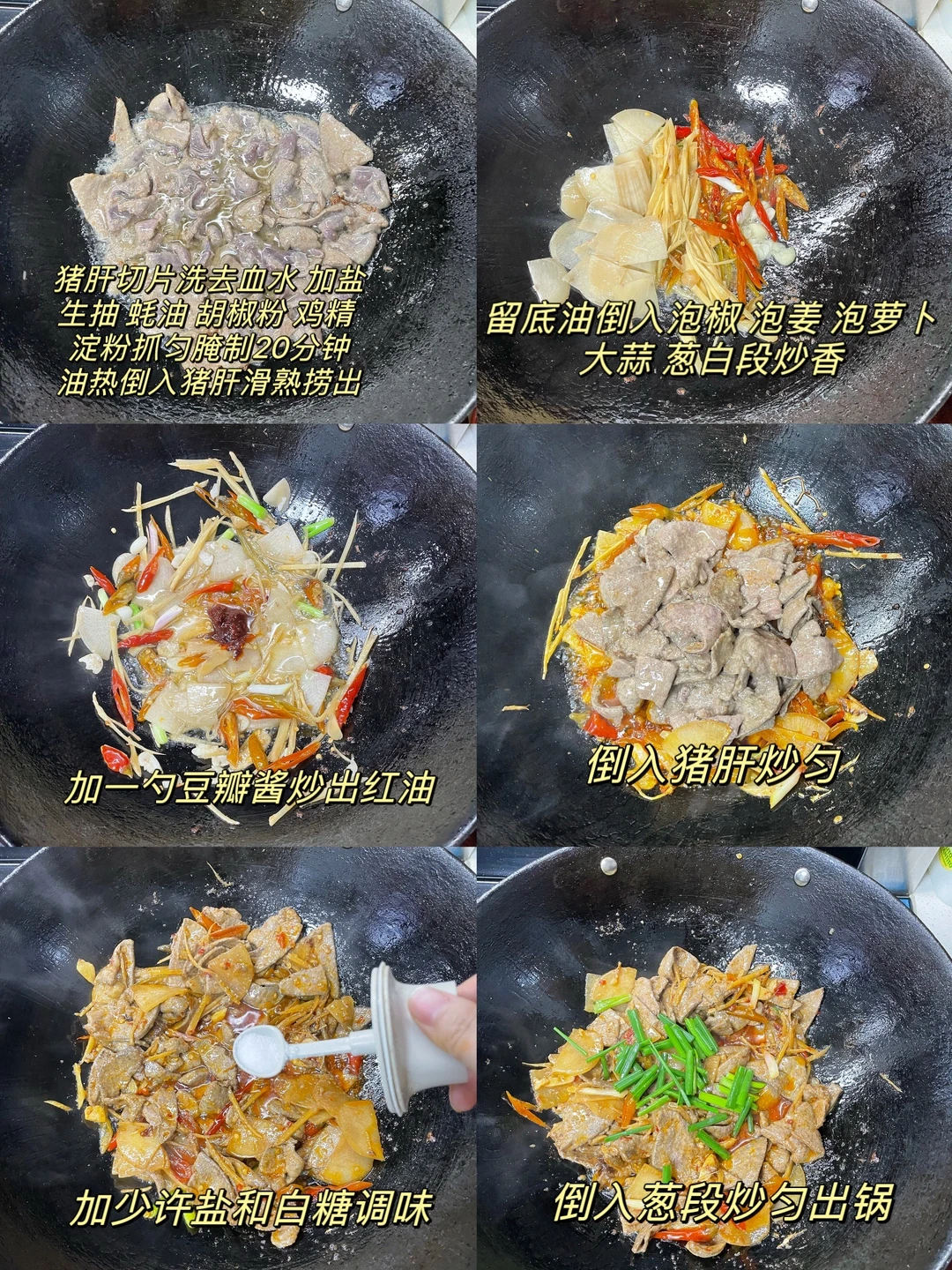 泡椒猪肝也太下饭了,这样做出来一点腥味儿也没有,直接用它下两碗饭 1⃣️:猪肝切片洗去血水沥干水分,加盐 生抽 蚝油 胡椒粉 鸡精 淀粉抓匀腌制20分钟 2⃣️:油热倒入猪肝快速炒变色捞出,留底油倒入泡椒 泡姜 泡萝卜 大蒜 葱白段炒香,加一勺豆瓣酱炒出红油,倒入猪肝炒匀,加少许盐和白糖调味,起锅前加入葱段炒匀即可