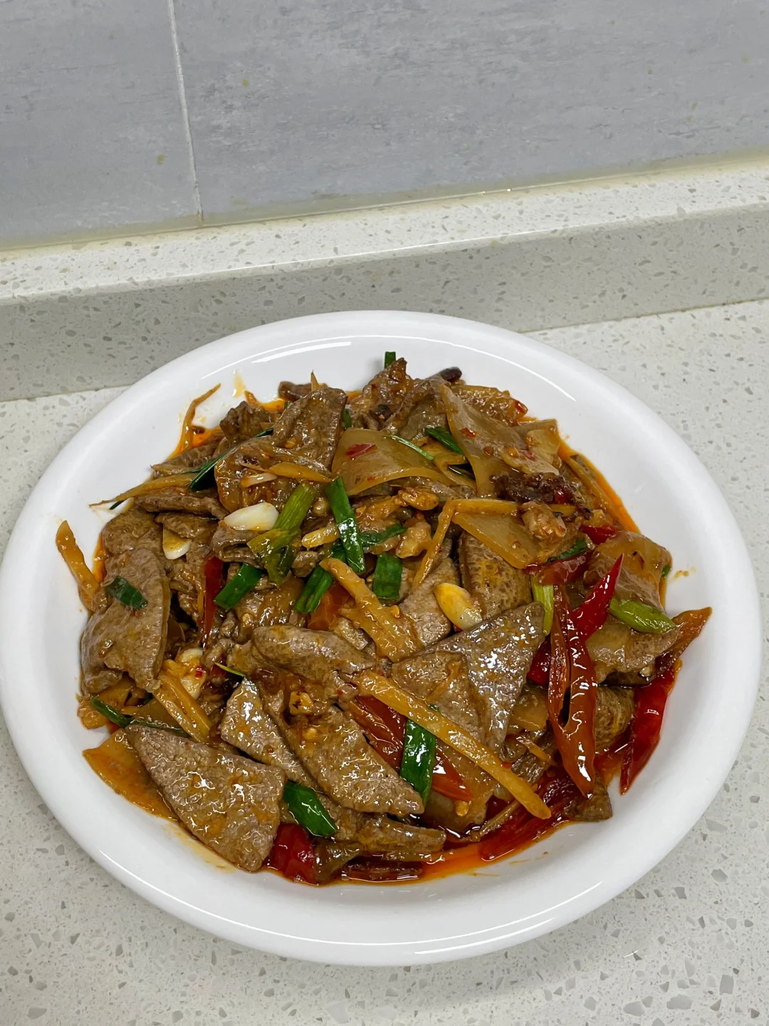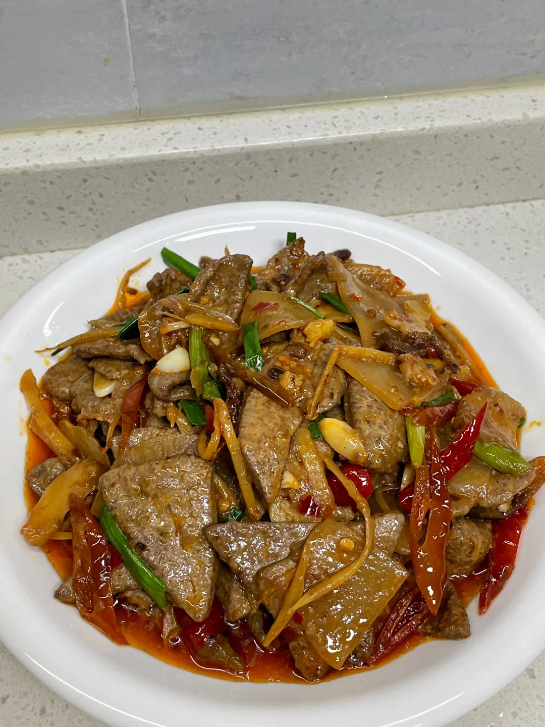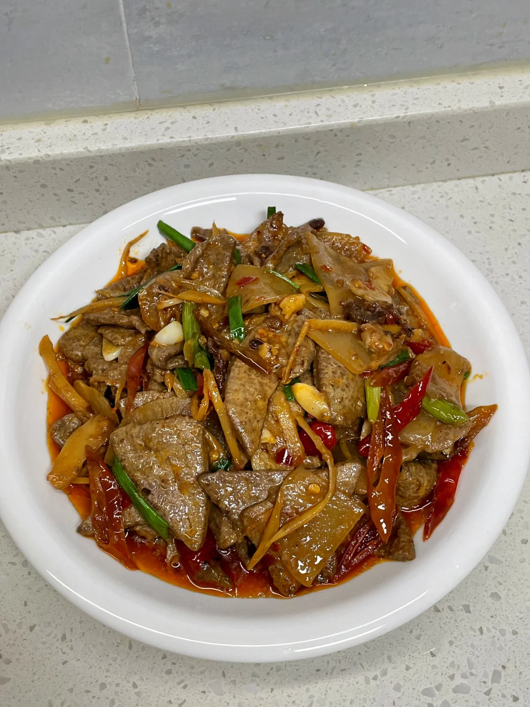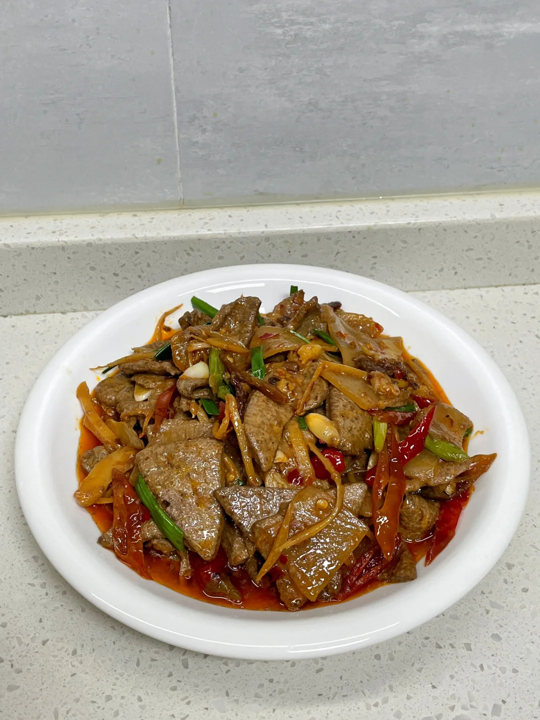 泡椒猪肝也太下饭了,这样做出来一点腥味儿也没有,直接用它下两碗饭 1⃣️:猪肝切片洗去血水沥干水分,加盐 生抽 蚝油 胡椒粉 鸡精 淀粉抓匀腌制20分钟 2⃣️:油热倒入猪肝快速炒变色捞出,留底油倒入泡椒 泡姜 泡萝卜 大蒜 葱白段炒香,加一勺豆瓣酱炒出红油,倒入猪肝炒匀,加少许盐和白糖调味,起锅前加入葱段炒匀即可