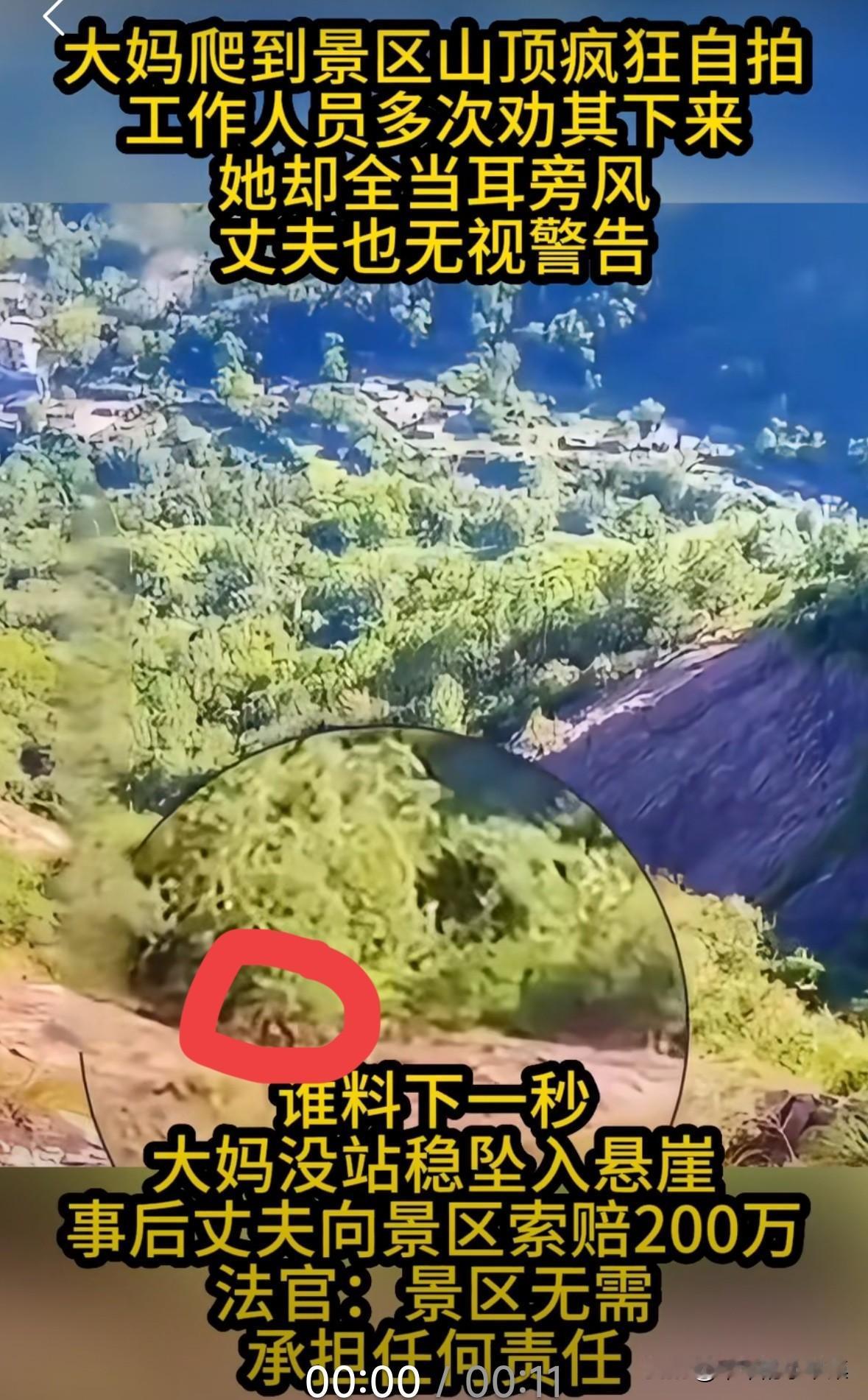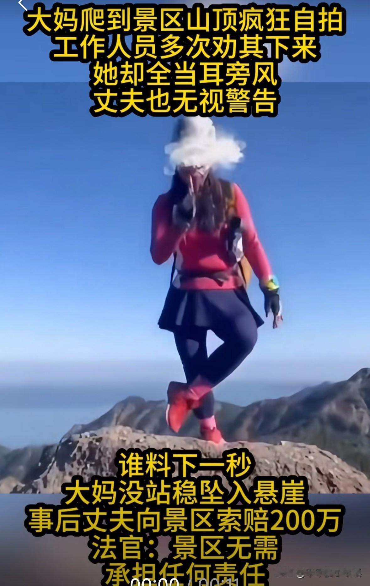 大妈爬到景区山顶拍照,景区工作人员多次劝告危险,让大妈下来,大妈却置之不理。 一旁的丈夫也无视工作人员的警告,给大妈拍照。 没想到下一秒,大妈没站稳,直接从山上掉了下去! 这山这么高,肯定活不成了。 于是丈夫向景区索赔200万,最终法院审判,景区无需承担任何责任。 我觉得是丈夫故意的,哪有丈夫看着妻子在危险的地方不管不顾的。 丈夫没有阻止,妻子出事后财产全是他的,甚至还能索要一笔赔偿,这算盘打的太响了。 男人从来就是理性的动物,他们只做对自己有利的事情,太可怕了。山顶拍照