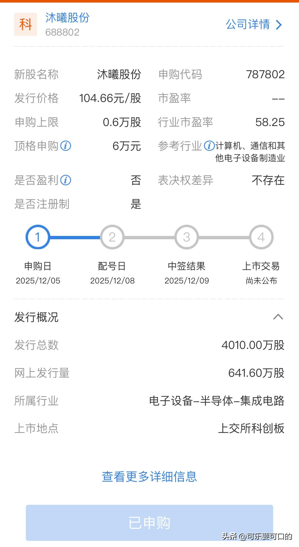 毫无参与价值!摩尔线程开盘即巅峰,没有给任何追涨的机会! 本来看着有着国内GPU第一的摩尔线程要上市了,昨天都计划好了怎么也要参与一下。 但没想到摩尔线程开盘即大涨468%,股价也高达650元每股,而市值也一步跨过了3000亿,简直极其夸张! 眼见此情此景,果断放弃了追涨买入!果不其然,摩尔线程的开盘价几乎是全天最高价,仅在开盘后稍微拉升了一下,一度冲到了688元每股! 但是此后就一直在4倍涨幅上震荡,直到下午1点40分后才有所拉升,但是并未过早上的高点就再次回落,最终收涨425%,而一签则大约可挣25万多,由此也成为今年最大肉签! 没能中摩尔线程,但是希望今天的沐曦股份能够中签吧[祈祷]!加油[点亮平安灯]!