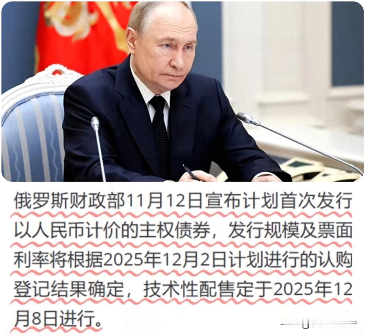 炸锅!俄罗斯 狂发人民币国债, 6%-7%高息背后美元霸权真的慌了 2025年12月俄罗斯财政部发行200亿元人民币主权债,其中2029年到期债券利率6%、2033年到期债券利率7%,与文中“6%、7%以上利息”完全吻合。受西方制裁影响,俄罗斯美元/欧元融资渠道被彻底切断,而其对华能源贸易积累了大量闲置人民币,发行人民币债既填补了5.7万亿卢布的财政赤字,也盘活了沉淀的人民币资产。 中国与32个国家和地区签署的本币互换协议总规模确已突破4.5万亿元,CIPS人民币跨境支付系统覆盖189国,2025年上半年处理业务量达90.19万亿,成为绕开美元支付体系的核心通道。俄罗斯此举本质是以国家信用为人民币国际化背书,中俄贸易95%已改用本币结算,这一趋势绝非偶然,而是全球去美元化、人民币信用提升的必然结果。 网民说:- 网友:高息是表象,本质是人民币成了硬通货!俄方用真金白银给咱站台~ - 网友:从赚美元到收人民币国债利息,这波风水轮流转,咱的底气藏在工厂和货轮里! 欢迎评论区讨论:你觉得俄罗斯发行人民币国债,会加速更多国家放弃美元结算吗?