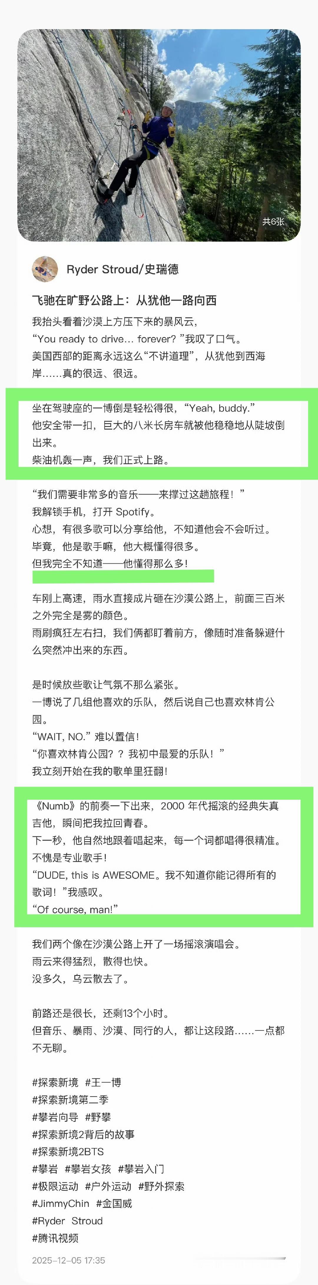 “坐在驾驶座的一博倒是轻松的很,“Yeah,buddy。” 他安全带一扣,巨大的八米长房车就被他稳稳地从陡坡倒出来。” “他是歌手嘛,他大概懂得很多。但我完全不知道——他懂得那么多!” “下一秒,他自然地跟着唱起来,每一个词都唱得很精准!不愧是专业歌手!” 王一博在《探索新境2》里的“北美攀岩之旅”的好搭档史瑞德,又分享了一些幕后故事和新的照片。 史瑞德看到的王一博——可以依靠的伙伴,了解很多欧美音乐、和自己一样喜欢林肯公园,跟唱发音很精准能记得所有歌词!不愧是专业歌手! “前路还是很长,还剩13个小时。 但音乐、暴雨、沙漠、同行的人,都让这段路……一点都不无聊。” 有这样的“旅伴”,旅程怎么会无聊呢?王一博从专业实力到多领域实力到性格人品所展现出来的人格魅力,就这样自然而然的征服那些真诚的合作伙伴。 王一博 王一博探索新境2