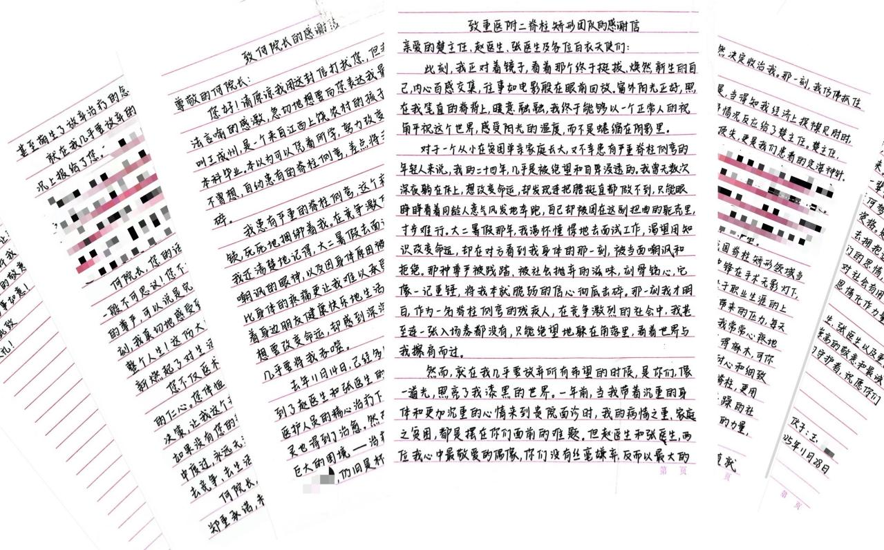 “窗外阳光正好,照在我笔直的脊背上,暖意融融,我终于能够以一个正常人的视角平视这个世界,感受阳光的温度,而不是蜷缩在阴影里。”近日,来自江西的24岁小王,在重医附二院骨科二病区圆满解决了脊柱畸形、心理自卑问题。为感谢这份恩情,他分别给医院与骨科二病区主任楚磊团队写了信,饱含真挚情感的字字句句,记录了他从“弯腰蜷缩”到“昂首挺胸”的重生。