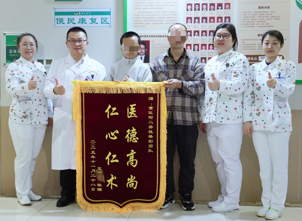 几天后,楚磊教授、赵登副主任医师、张钟主治医师团队,经过7小时的奋战,顺利为小王实施手术。术后,医生团队定时查房,调整治疗方案;护理人员耐心翻身、按摩,指导康复训练;社会爱心人士每天送免费鸡蛋等,给予营养支持……经过精心治疗护理,小王康复出院测量身高时兴奋不已,“我现在163cm,比之前长高了19cm”,并送来锦旗与感谢信:“感谢医院和楚主任团队,不仅用精湛医术拯救了我的脊柱,更用暖心行动治愈了我的心灵。将来我有能力了,一定要像他们一样,帮助更多和我有同样遭遇的人!”