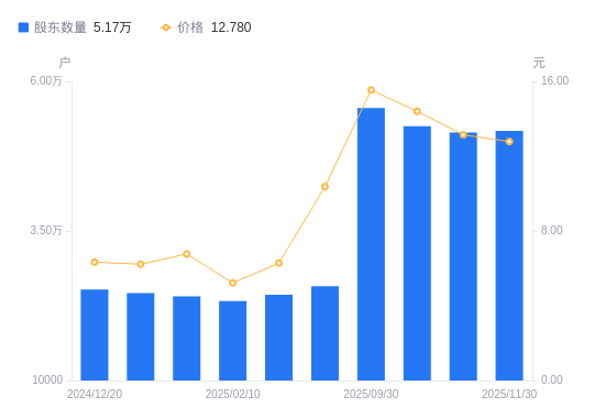 日期A股户数(户)流通A股户均持股数(股)户均持股市值(万元)2025-11-305172913326.9017.032025-11-205145713397.3417.602025-11-105252013126.1818.902025-09-305553412413.7919.292025-06-302575226557.9227.542025-03-312432029732.0918.672025-02-102328031060.3316.212025-01-102406230050.8920.342024-12-312460729385.3218.282024-12-202521829580.3018.72