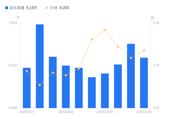 日期A股户数(户)流通A股户均持股数(股)户均持股市值(万元)2025-11-306186571061.5258.272025-09-306512067509.5453.672025-07-316025872836.1160.672025-07-205814275486.8966.962025-06-305726876638.9365.682025-04-205949173775.1756.072025-04-106000873139.5653.982025-03-316206970710.9652.822025-02-286971456450.7539.852025-01-275947966164.6649.76