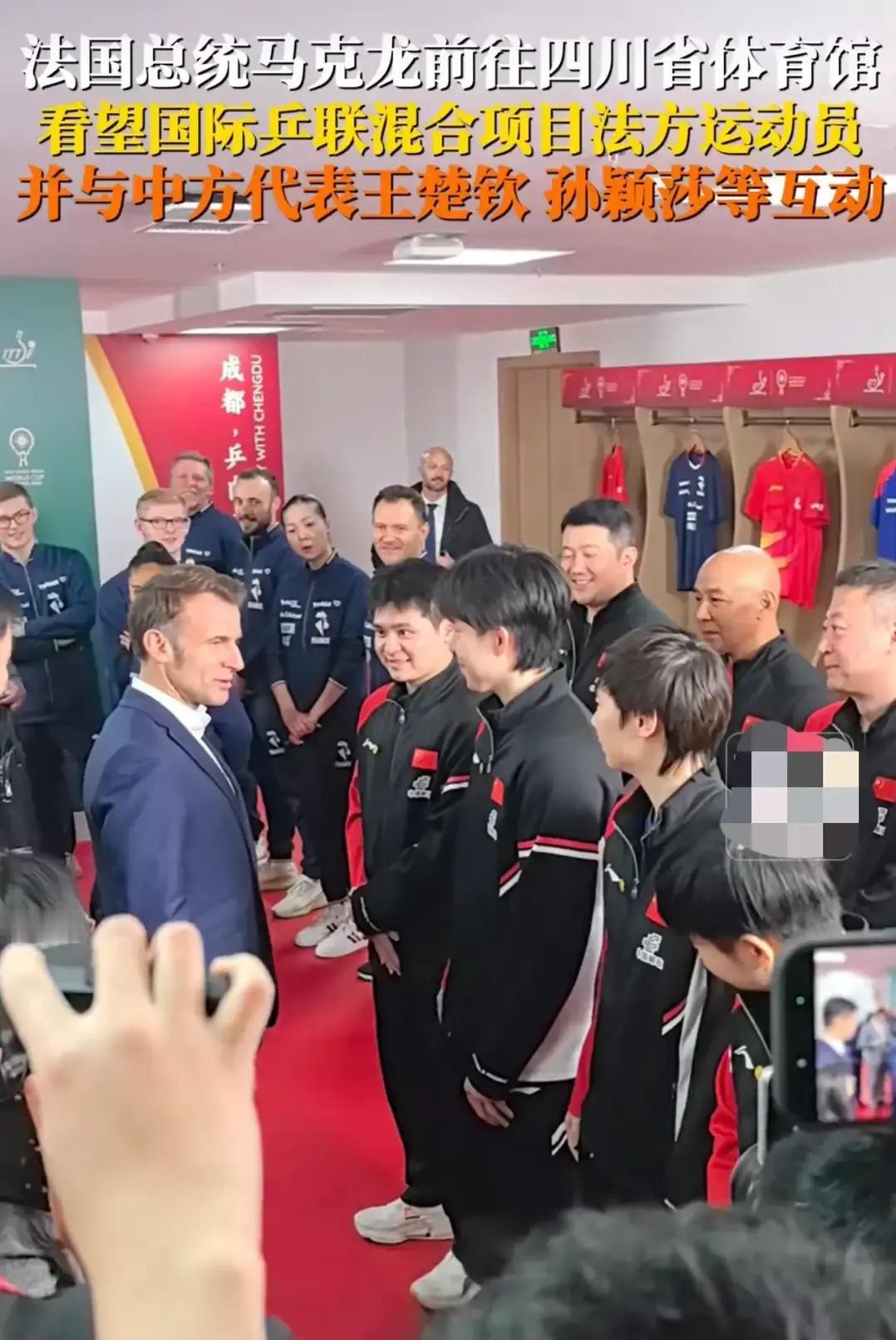 法国总统马克龙也是乒乓球爱好者呢。12月5日,马克龙抵达四川成都,他先是去了锦城湖旁晨跑,后又去看了大熊猫,下午抵达四川省体育馆,看望国际乒乓球混团比赛。 马克龙和现场的乒乓球运动员王楚钦,孙颖莎,王曼昱等人热情打招呼。 随后,马克龙还和王楚钦,孙颖莎打乒乓球,他穿着西装动作受限,但看样子是挺会打乒乓球的,打得有来有回,很是沉浸,现场也是很热烈,一片热闹和谐。