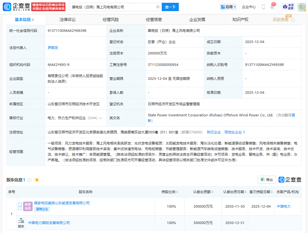 企查查APP显示,12月4日,国电投(日照)海上风电有限公司成立,法定代表人为罗朝发,注册资本20亿元人民币,经营范围涉及风力发电技术服务、海上风电相关系统研发、光伏发电设备租赁、太阳能发电技术服务、新能源汽车换电设施销售等。企查查股权穿透显示,该公司由中国电力(02380.HK)间接全资持股。