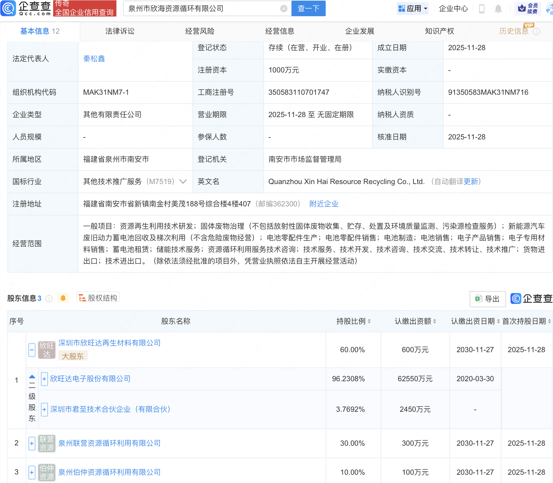 企查查APP显示,近日,泉州市欣海资源循环有限公司成立,注册资本1000万元,经营范围包含:电子专用材料销售;蓄电池租赁;储能技术服务;资源循环利用服务技术咨询等。企查查股权穿透显示,该公司由欣旺达(300207)旗下深圳市欣旺达再生材料有限公司等共同持股。