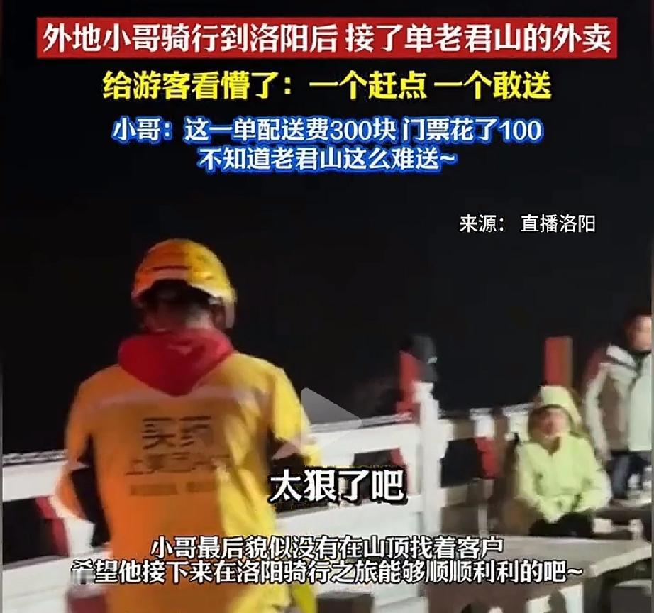 12月4日,河南洛阳。在老君山的一名游客忽发奇想,能否有人把外卖送到山顶来,于是下了一单外卖。 说来也巧,正好一位外地小哥骑行环游中国,顺便也送外卖。他到了洛阳,接下了这一单。 这一单300块钱。他买门票用了100块钱,进了景区。为尽快找到顾客,沿途的风景都来不及欣赏。用了40分钟,气喘吁吁的到达了山顶,可是却联系不上顾客。 这一单外卖小哥挣了200块,不过这一单也是最辛苦的。 外卖员真的是让人称奇,网友们感叹道,一个敢点,一个敢送。 谁把外卖点到老君山山顶了奇闻趣事 老君山