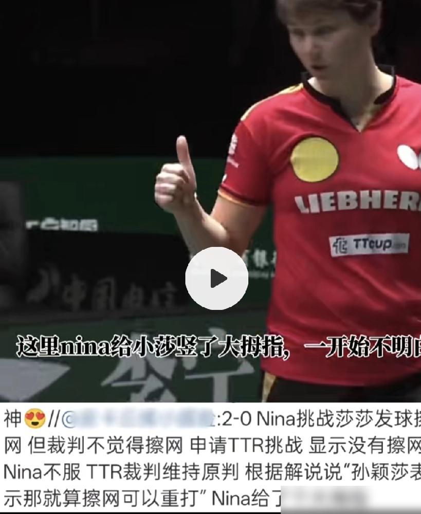 成都混团中国对德国 ​ 莎莎和尼娜第二局的小插曲也太显格局了吧! ​ 第二局有个球尼娜认定莎莎发球擦网,当场申请挑战。结果回放清清楚楚,球压根没碰网子,挑战直接失败! ​ 这事儿看着小,其实特有意思。莎莎这反应,绝了。明明得分板上已经给自己加了一分,硬是主动让出来。尼娜那边呢,挑战失败了还跟裁判掰扯半天。 ​ 查了下背景,这是成都举办的国际乒乓球混合团体赛。孙颖莎(莎莎)世界排名第一,对手是德国的尼娜·米特兰姆。实力差距确实明显。 ​ 但恰恰是这种稳赢的局面,才更考验运动员的心性。莎莎想的是赶紧打完这个插曲,继续比赛。她眼里是整场比赛的流畅,是体育精神的体现。尼娜纠结那一分,反而显得有点小家子气。 ​ 乒乓球比赛里,鹰眼挑战系统是为了公平。规则上,挑战失败就是失败,这分就该归莎莎。莎莎主动提出重发,其实是超越了规则要求的高姿态。这不是傻,是自信,是大气。 ​ 想想看,世界第一差这一分吗?根本不差。她差的是用行动告诉所有人,什么叫顶尖选手的风度。球品见人品,这话一点不假。 ​ 尼娜的反应也能理解。实力弱的一方,可能对每一分都看得特别重。但越是这样,越容易心态失衡。竞技体育,输赢固然重要,但怎么输、怎么赢,更能看出一个人的底色。 ​ 莎莎这种处理方式,不是第一次了。她场上场下,一直挺大气。难怪那么多球迷喜欢她。技术好的人不少,但技术好又有人格魅力的,才是真正的偶像。 ​ 这场比赛中国队最后肯定是大比分赢了。但让人记住的,反而是这个小插曲。体育的魅力,有时候不在金牌,而在这些闪光的瞬间。 ​ 真正强大的选手,赢球也赢心。莎莎这格局,活该她当世界第一。 ​