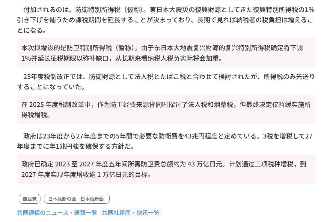 🔻共同社报道:日本自民党政府为了确保增加军费开支的财源,准备增加日本人的所得税1%,称之为防卫特别所得税(暂称)。🔻这题我会,日本计划开征辽饷了!🔻这是为扩军而增税啊。而且还是直接从工资里扣缴的所得税。到手工资要减少了。愚蠢的 75%日本人。热点现场海外新鲜事日本再将7800吨核污染水排海