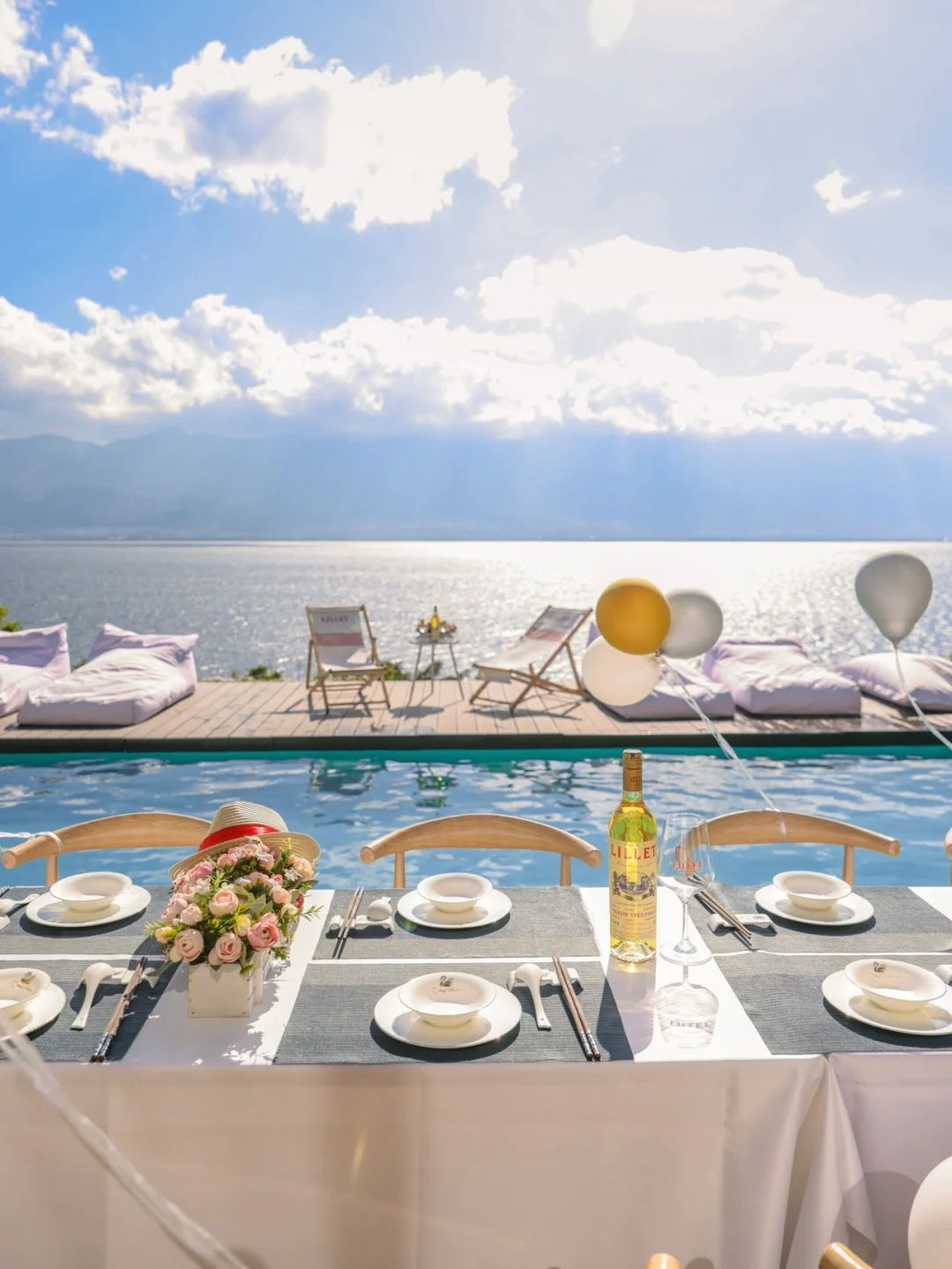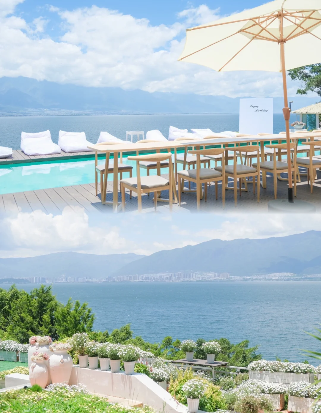 3⃣️面朝大海🌊,花园洋房,希腊建筑、无边泳池;室外有吧台、露营⛺️篷,可定制餐饮,每一处都是出片圣地📷。
