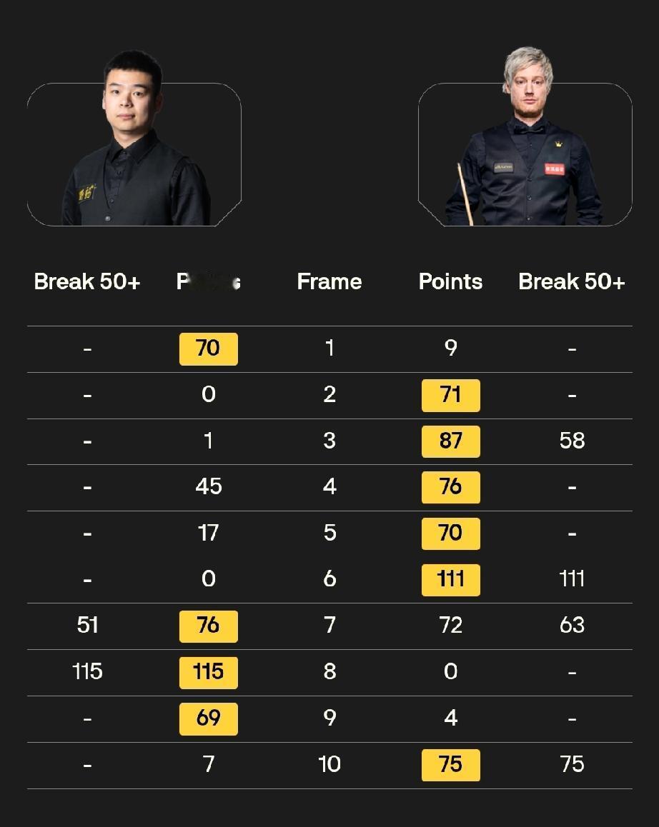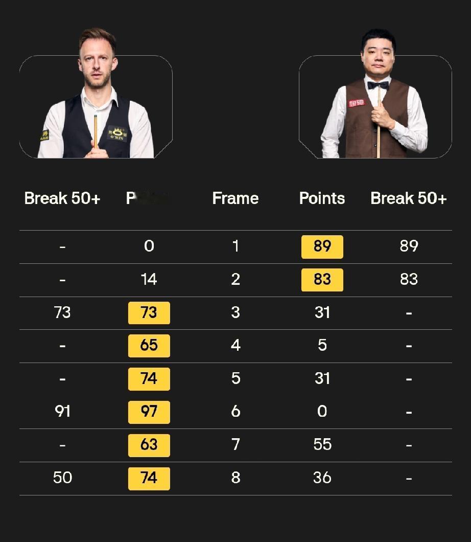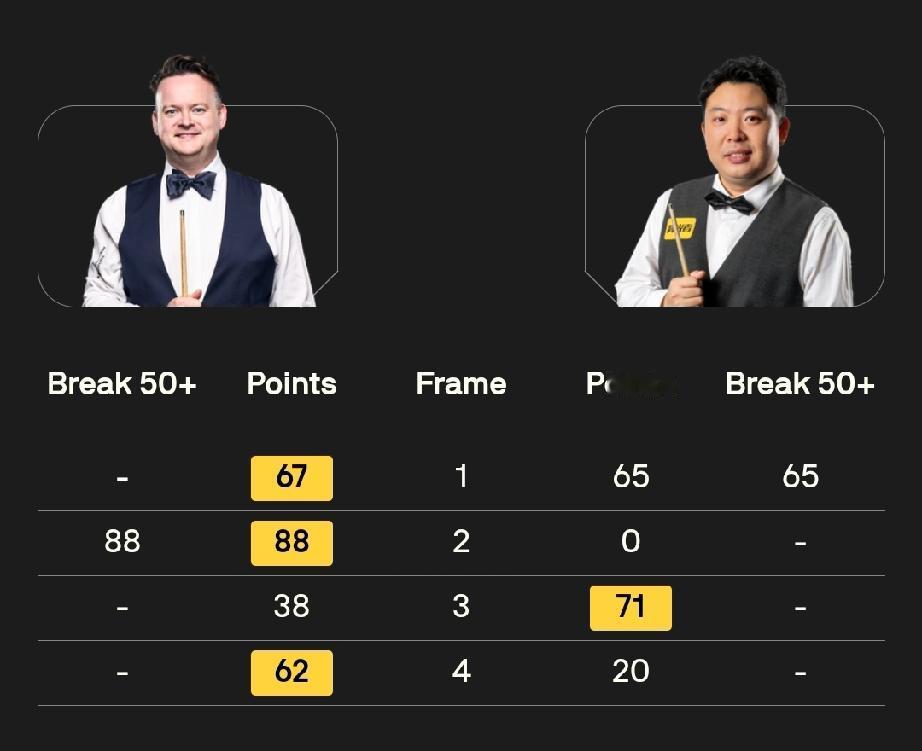 张安达 1-3 肖恩·墨菲 马克·塞尔比 2-1 巴里·霍金斯 丁俊晖 2-6 贾德·特鲁姆普 庞俊旭 4-6 尼尔·罗伯逊 北京时间12月5日晚21点,2025斯诺克英锦赛8进4轮次上半区比赛开杆。丁俊晖头两局发挥出色,打出单杆89分、83分,2-0领先贾德·特鲁姆普。随后,场上风云突变,贾德·特鲁姆普连赢六局!6-2淘汰丁俊晖,晋级四强!这六局丁俊晖发挥实在太差了! 庞俊旭拿下第一局取得开门红以后,尼尔·罗伯逊发挥神勇连下五局!绝境中,庞俊旭打出单杆51分、115分,连赢三局!表现出大心脏和不服输的顽强拼搏精神!最终4-6不敌尼尔·罗伯逊,止步八强。本站比赛,庞俊旭各方面表现十分抢眼,虽败犹荣,可以昂首离开! 下半区8进4轮次,前四局,张安达1-3肖恩·墨菲。