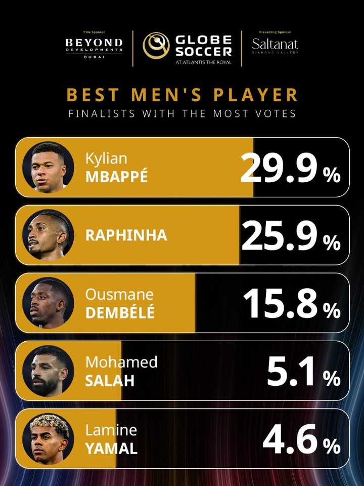 直播吧12月6日讯环球足球奖官方晒出了2025年最佳球员的投票情况,姆巴佩29.9%领跑。