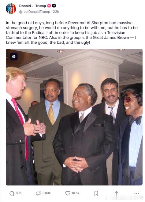 【黄金时代】川普回忆,在他没当总统的“过去的好日子”里,所有现在反对他的人也是他的朋友川普:在过去的好日子里,在阿尔·夏普顿牧师做完胃部大手术之前很久,他为了和我在一起什么都愿意做,但他为了保住自己在NBC电视台的评论员工作,不得不忠于激进左派。还有伟大的詹姆斯·布朗也在这群人里——我认识他们所有人,好的、坏的、丑陋的!美国和欧洲当代史川普主义研究热点现场海外新鲜事