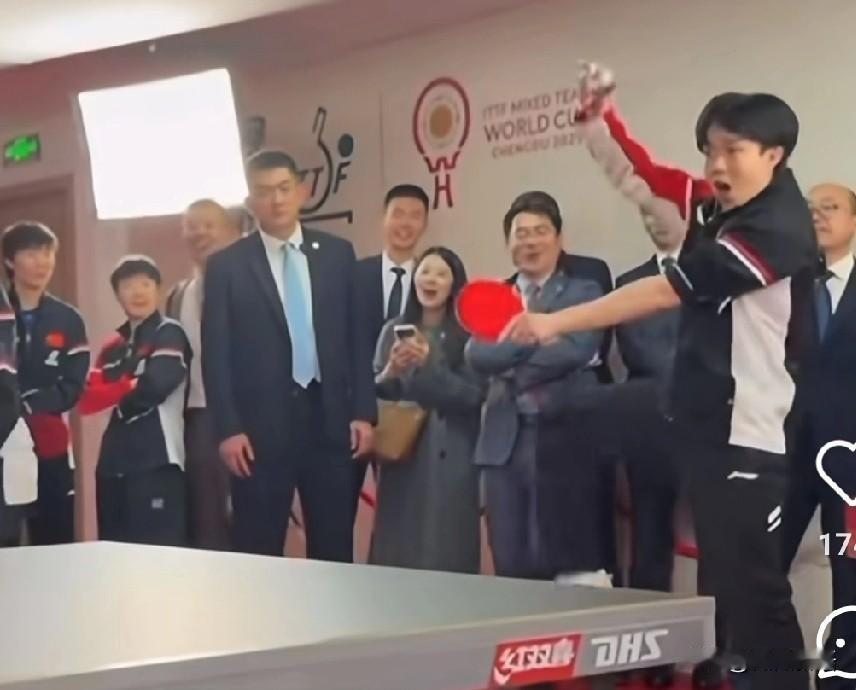 马克龙也是打上混双了,对面还是王楚钦和孙颖莎,这个画面真的很暖啊。 马克龙也来成都了,他去了成都世界杯公园,跟法国队和中国的球员见面了,马克龙也拿起球拍打乒乓球,他和菲利克斯勒布伦一起打了男双,还和帕瓦德一起打混双,对面是我们的莎头组合。打混双的时候也挺有意思,马克龙喜欢让莎莎发球,莎莎用的勾手发球,马克龙没接住球,然后让莎莎再给他发,依然没接住,楚钦在后面开心的捡球,这个氛围真的很好啊。 这才是快乐乒乓吧,打男双友谊赛时,楚钦又练起“功夫”来了,哈哈,这孩子私下里确实很幽默啊,他这个动作把在场的人都逗笑了,小莎看到她哥这个动作,也憋笑了。 虽然这几天打比赛很累,但是在和法国总统打球时,楚钦状态也很好啊,马克龙在和楚钦握手时,楚钦也是很有礼貌的,不知道他和马克龙说了啥,把林诗栋、王曼昱和莎莎都逗笑了。今天中国队还有两场比赛,大家都加油!