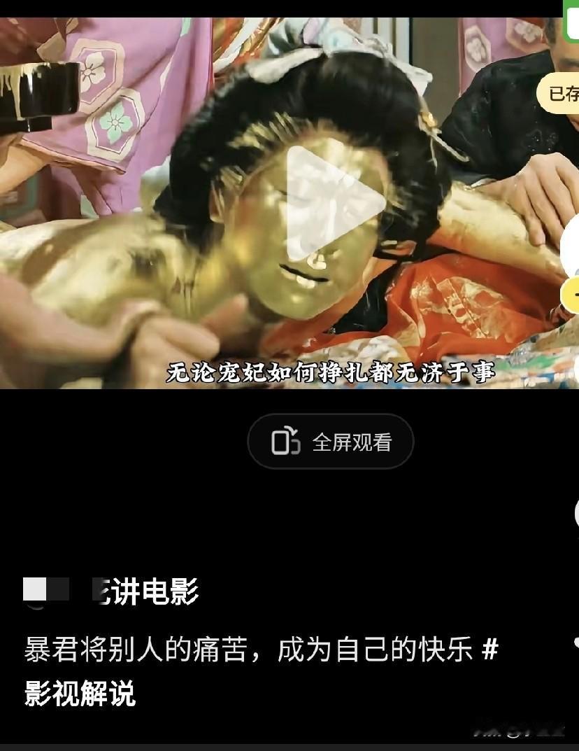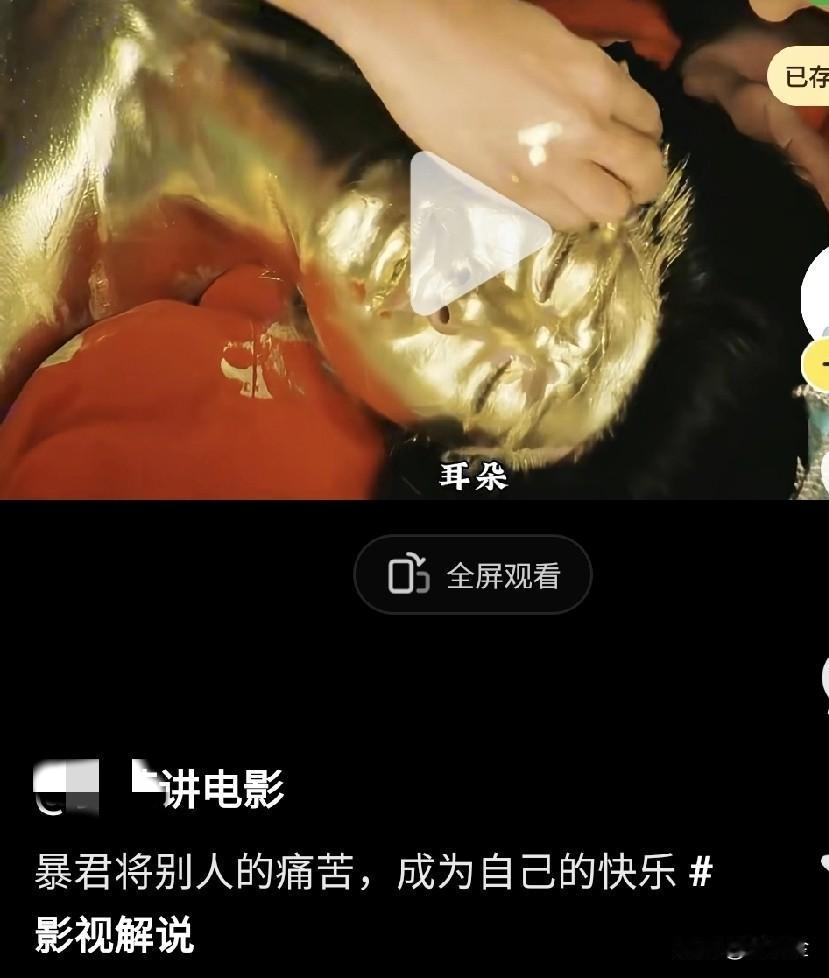 现在的电影短剧拍的都很辣眼睛,让人不能直视。 刚看到一个电影视频剪辑, 说的是一个暴君 竟然用黄金涂抹宠妃全身, 甚至连眼睛鼻子嘴 都不放过。 看着别人痛苦难受, 他觉得很快乐。 这就是典型的, 让自己的快乐建立在别人的痛苦之上的人。 现在编剧导演, 真是什么都想的出来, 我在想黄金这么贵, 怎么舍不得涂抹全身呢? 可能是假的吗? 是金粉吧! 不可能是黄金。