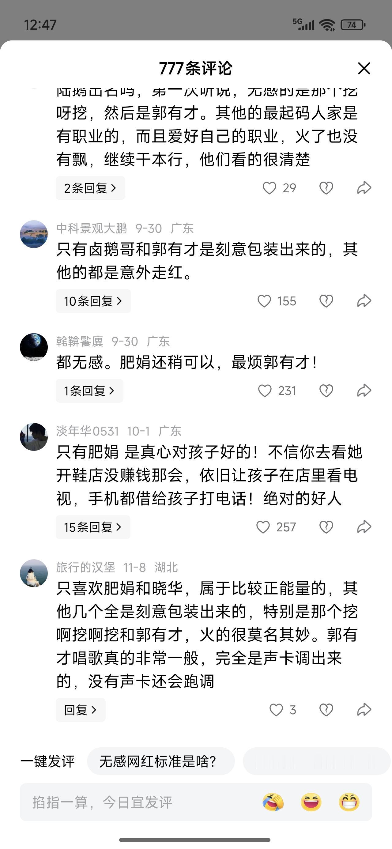 曾经爆火的几个草根明星,你对哪个最无感? 卤鹅哥我不能理解。爆火以后自己连个房子都没有。四处疯癫,居无定所。不踏实。 鸡排哥,给小朋友便宜一块钱。表情太夸张。夸张到炸! 郭有才,唱的一般,太一般了。还在活跃。有两下子。或者是,被资本捧红了。 挖呀挖,挺好看的。 晓华是真剪头发。 肥娟对小朋友很有耐心,两口子不会算账。得找个会计,挣点钱,自己花啊!