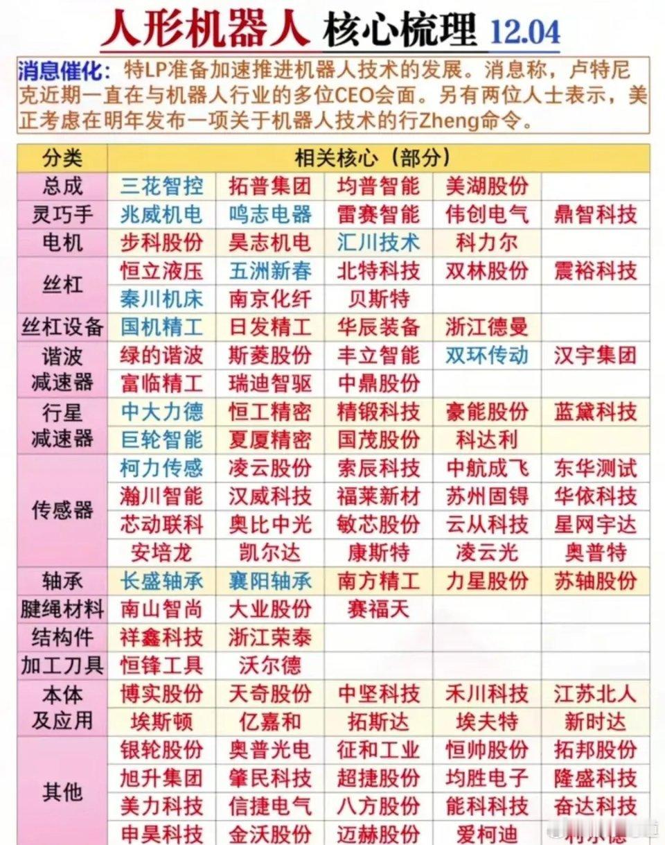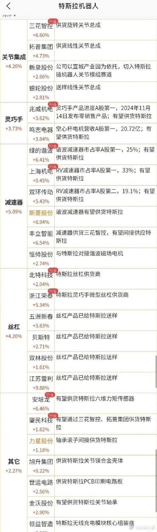 特斯拉机器人技术新突破,国内哪些公司与特斯拉机器人概念高度关联?12月3日特斯拉发布实验室跑步视频,擎天柱以约3.8米/秒速度稳定慢跑,该视频引爆全网,马斯克称V3版将于2026年初发布,逼真度还有大幅提升。特斯拉机器人的“供应链拼图”全面梳理从关节、灵巧手到减速器,A股公司分食千亿蛋糕。与特斯拉机器人高度关联的公司有拓普集团、三花智控、浙江荣泰、北特科技等等。北特科技:特斯拉丝杠的Tier2供应商三花智控:机器人关节模块核心供应商浙江荣泰:特斯拉机器人“灵巧手”的核心供应商之一,合作关系明确……理财有风险投资需谨慎资料取材网络仅供参考不能作为投资依据。股事论道今日看盘股票
