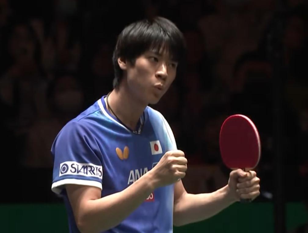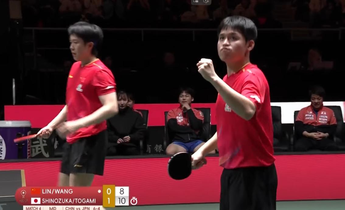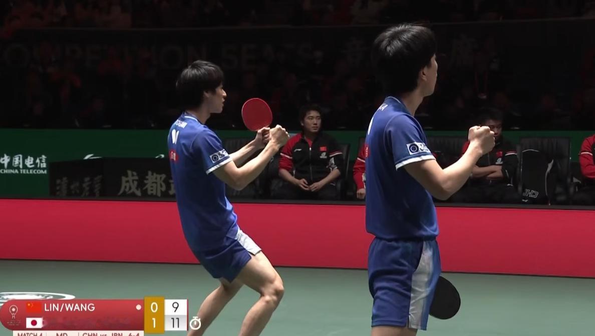 户上/大登赢了两局, 又开始嚣张了, 别忘了,我们最强的是女双呢! 男双比赛中, 第一局 户上/大登11:7赢了王楚钦/林诗栋 第二局 户上/大登10:6拿到了局点 王楚钦/林诗栋连追3球, 追到了9:10, 眼看着就打成了10;10平了, 结果大头爆冲还是失误了, 9;11输掉了第二局。 面对全场的加油声, 户上的庆祝动作也很嚣张呀。 不过就算你们3:0赢也没问题, 中国最牛的还是女双, 等着吧!