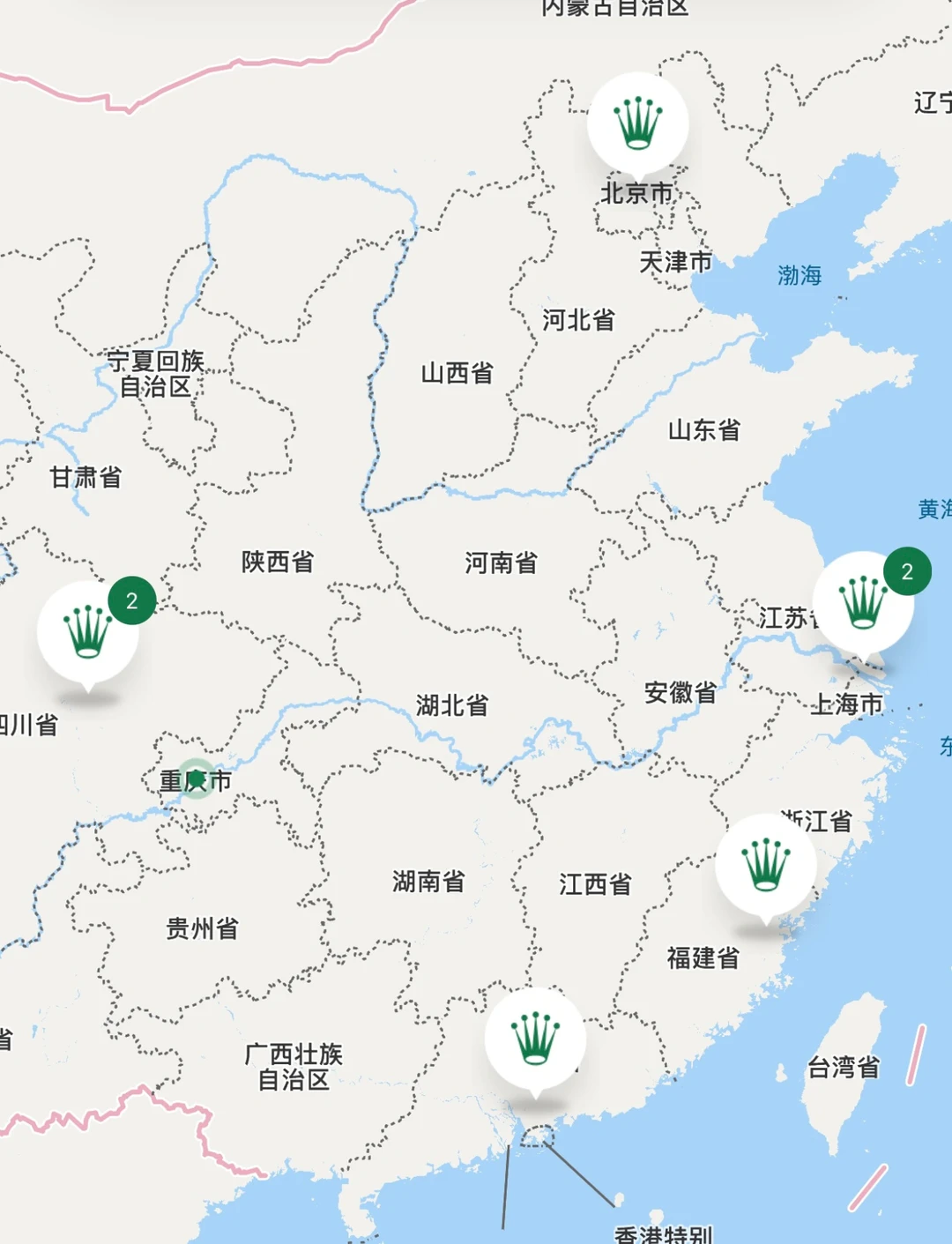 四大港资经销商的其他三家,布局都不如周生生均衡;东方表行在广州和上海很强(但北京已暂时撤店了);英皇则重仓北京和上海;周大福在一线城市没店,另辟“农村包围城市”策略。