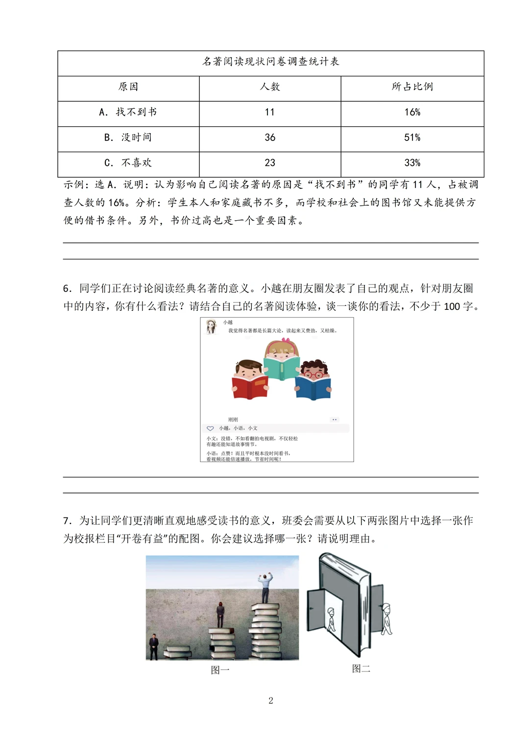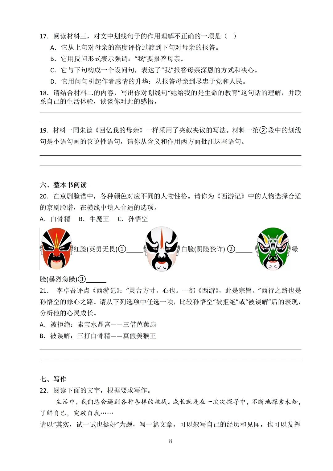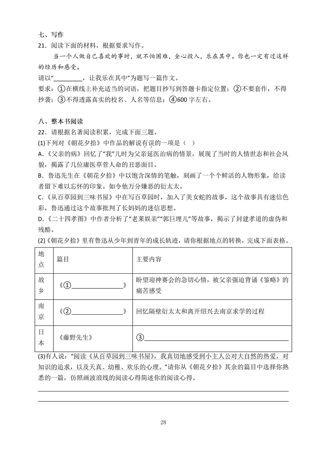 试卷整体难度会升级,基础版块引用非连续性文本,使用了柱状图和表格形式来考察,材料较多,要求学生快速捕捉关键信息。阅读理解和名著阅读考察形式更加新颖和多样化,作文考查情境作文。审题立意很关键!写人记事类、写景抒情类、文学创作类三类作文的写法都需熟悉。在考试时可以选择自己最擅长的一类来写