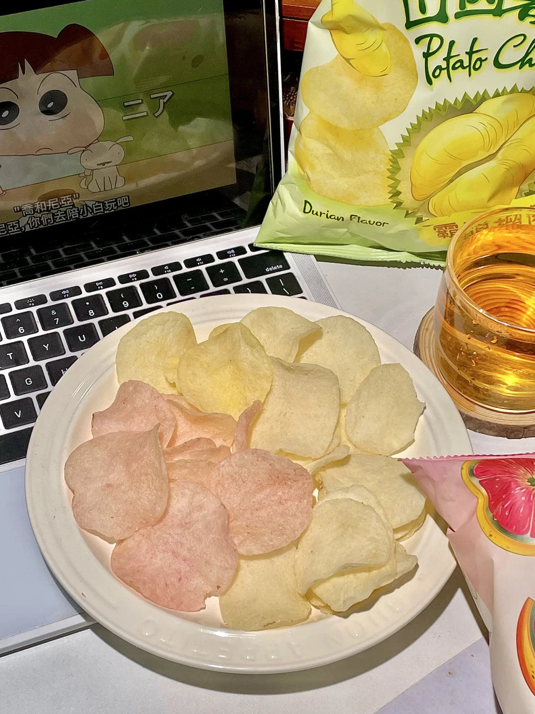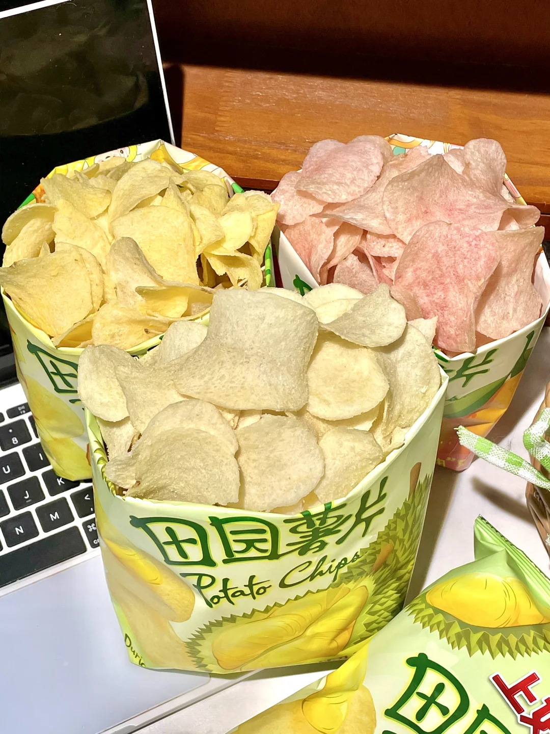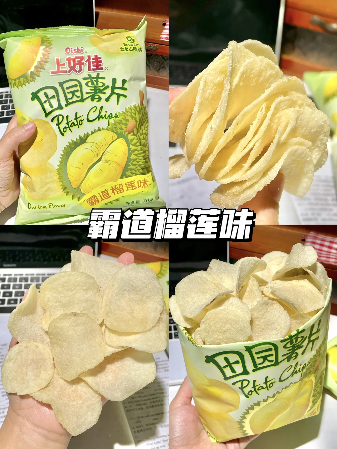 一打开就是很浓郁的榴莲香味,每片薯片上都添加真实榴莲粉,完全不是廉价香精味~讲真的,本来是抱着猎奇的心态试试的,没想到直接爱上了!!榴莲脑袋直接囤爆!