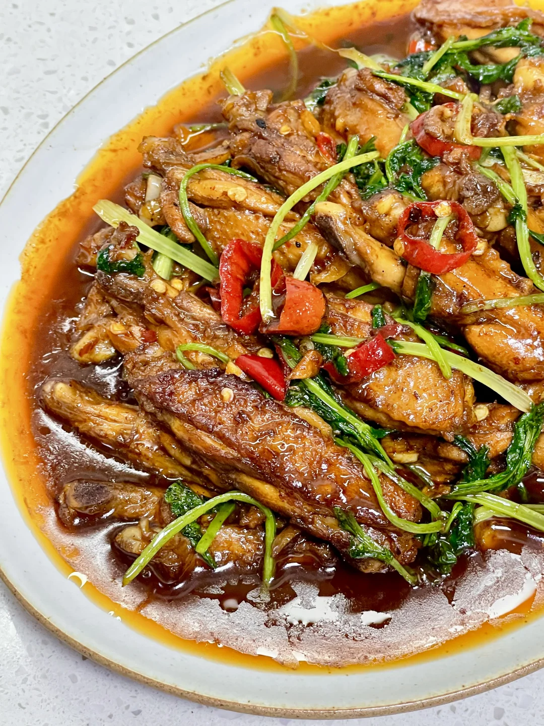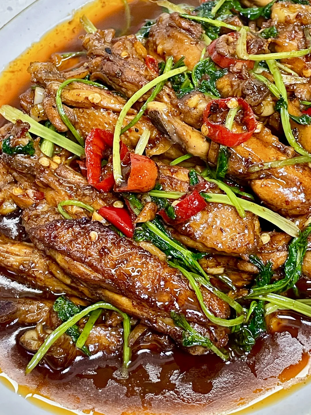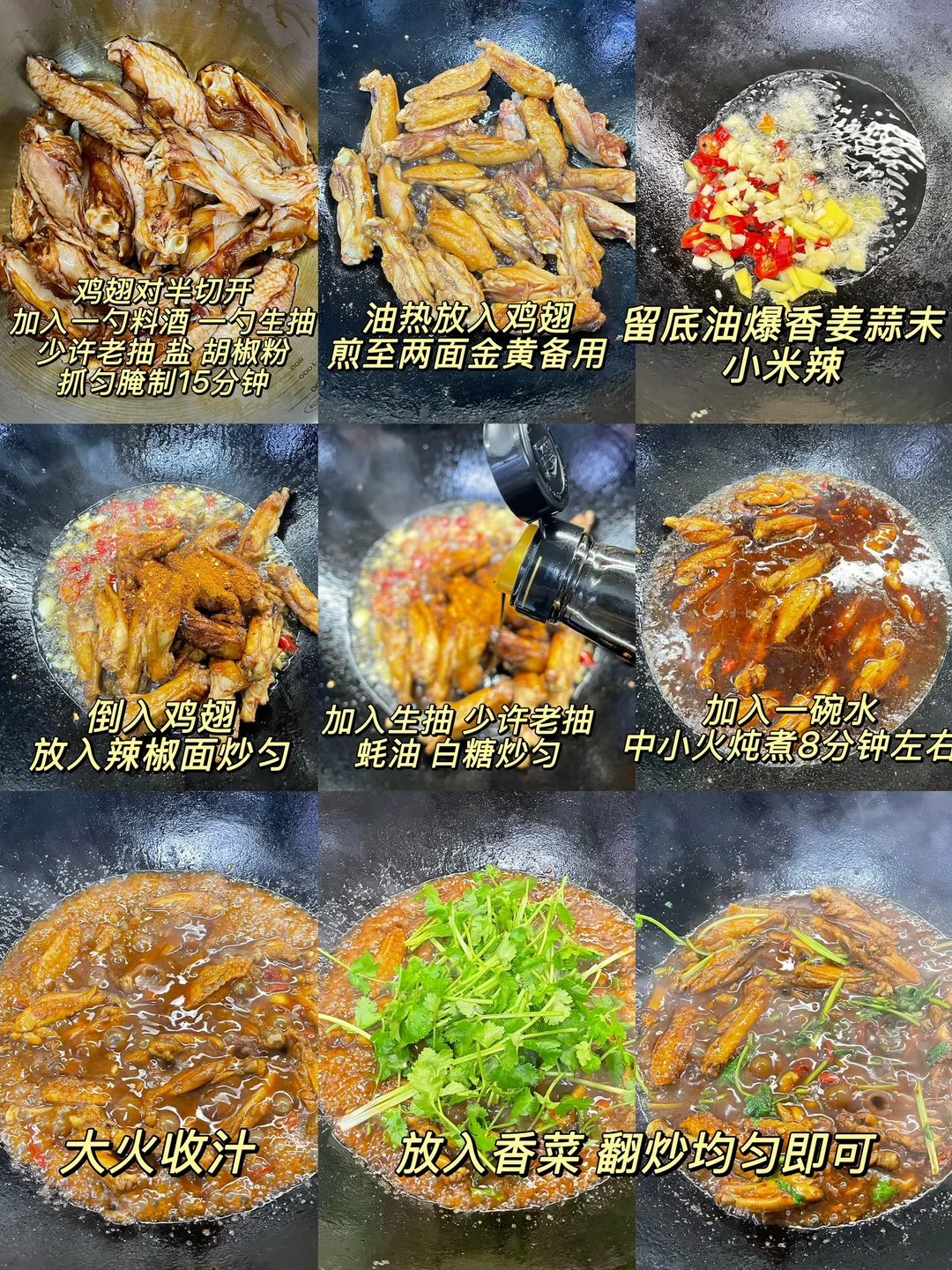 香辣鸡翅这样做怎么也吃不够,香香辣辣的,鸡翅外焦内嫩,香辣入味,一口一个停不下来~ 1️⃣:鸡切对半切开 加入一勺生抽 一勺料酒 少许老抽 盐 胡椒粉抓匀腌制15分钟 2️⃣:油热放入鸡翅煎至两面金黄备用,留底油放入姜蒜末 小米辣爆香,倒入鸡翅,加入辣椒面 生抽 老抽 蚝油 白糖炒匀 3️⃣:加入一碗水,中小火炖煮8分钟,转大火收汁,放入香菜炒匀即可