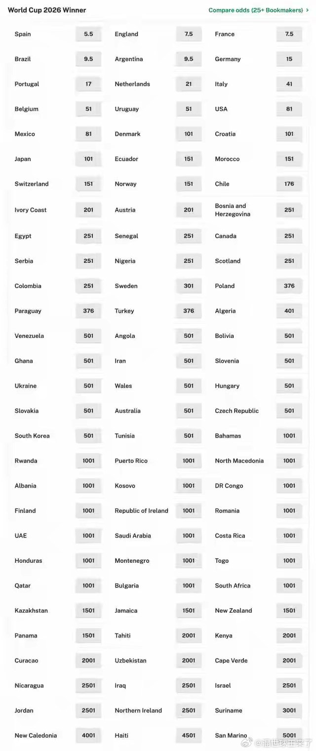 2026世界杯夺冠及金靴赔率出炉 西班牙成最大热门 2026美加墨世界杯48强分组落定后,博彩公司同步更新冠军与金靴夺冠赔率,西班牙以5.5赔率登顶头号热门,英格兰、法国同以7.5赔率紧随其后,巴西与阿根廷则以9.5赔率并列第四。值得关注的是,过往该赛事主办地赛事冠军均出自南美双雄,1970、1986年墨西哥世界杯冠军分别为巴西、阿根廷,1994年美国世界杯冠军则再度归属巴西。2026世界杯夺冠赔率TOP111. 西班牙:5.52. 英格兰:7.53. 法国:7.54. 巴西:9.55. 阿根廷:9.56. 德国:157. 葡萄牙:178. 荷兰:219. 意大利(暂未出线):4110. 比利时:5111. 乌拉圭:512026世界杯金靴赔率TOP111. 姆巴佩:92. 凯恩:93. 梅西:144. 哈兰德:175. 维尼修斯:266. C罗:267. 登贝莱:318. 沃尔特马德:349. 若昂·佩德罗:3410. 亚马尔:3411. 劳塔罗:34
