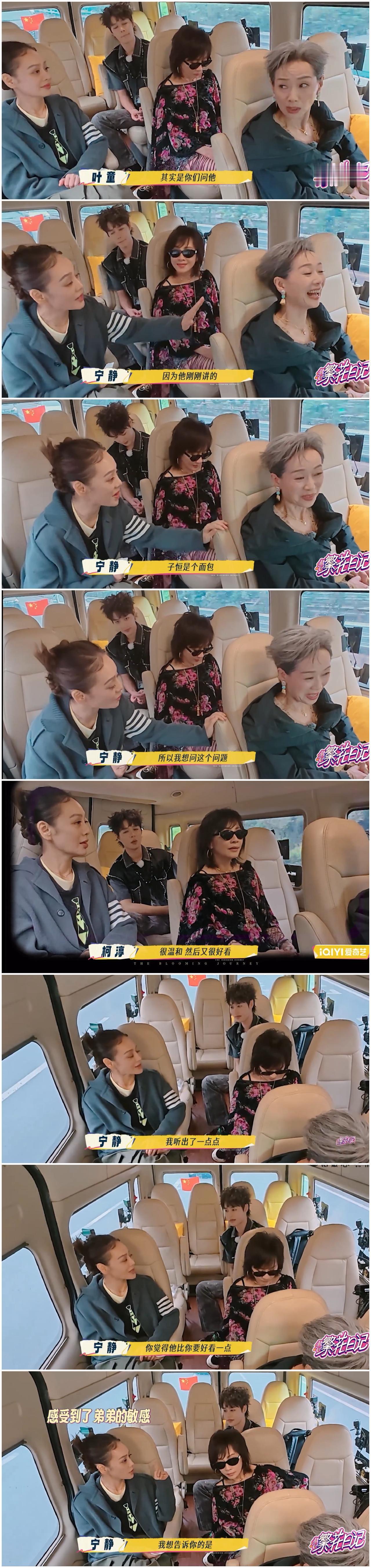 宁静与柯淳之间的谈话, 叶童听不下去了, 直接怼宁静。 宁静一时接不上话, 很久才反应过来。 宁静主动询问柯淳, 想知道柯淳认为 自己和邵子恒之间 到底谁好看。 柯淳毫不犹豫的回答 邵子恒比自己好看。 于是宁静就一个劲开导柯淳, 让柯淳不要在意这个问题。 叶童在旁边听不下去了, 反问宁静 “其实是你们问他” 意思是 人家柯淳可能本来没有那么在意 是否好看这个问题, 宁静非得问柯淳这个问题, 柯淳才开始在意起来。 是宁静挑起的事情, 后来又叫柯淳不要在意, 那么宁静的行为就前后矛盾了。 宁静听到叶童这样说, 马上不乐意了。 宁静解释道 是她从柯淳的言语中 感受到柯淳对于自己容貌很自卑, 所以才想起来当面戳破他的敏感话题, 让他勇敢面对自己容貌, 让他重拾自信。 是呀, 宁静太厉害了, 从柯淳的言语细节中 就可以感受到柯淳的敏感在意关键点, 及时开导他。 叶童不知道这个原因, 所以就误解宁静了。 不过叶童可以一针见血 指出问题所在, 也很厉害呀。 宁静和叶童都是“老江湖”了, 什么都躲不过她们的观察。