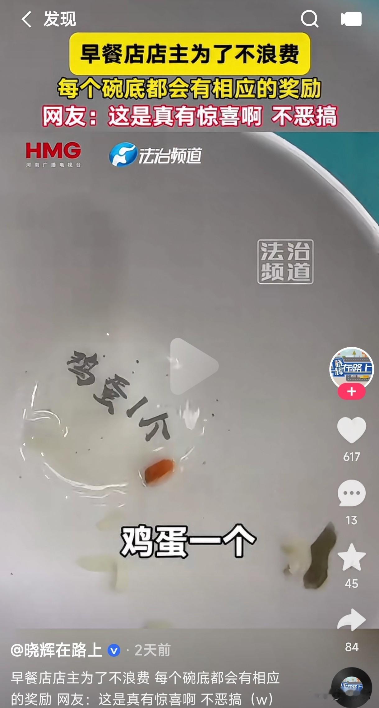 早餐店店主为了不浪费,居然每个碗底都有奖励,要么就是一个鸡蛋,要么就是一根烤肠,要么就是一瓶苏打水,这样的店家是不是每天都客源爆满? 会做生意的店家就是不一样,这样既防止了浪费又增加了人气,可谓是一举两得,有些人就是想加个鸡蛋或者烤肠,只要来个光盘行动碗底不就免费送一个吗?这样的店家每天是不是都客源爆满,生意不好都难不是吗? 在日常生活中这样的店家是不是很少,所谓是可遇不可求,打着灯笼都难找不是吗?不知道碗底的字是印上去的还是写上去的?如果长年累月一直这样送,是不是算下来也要一笔不少的费用,这样算下来是薄利多销的营生操作吗?