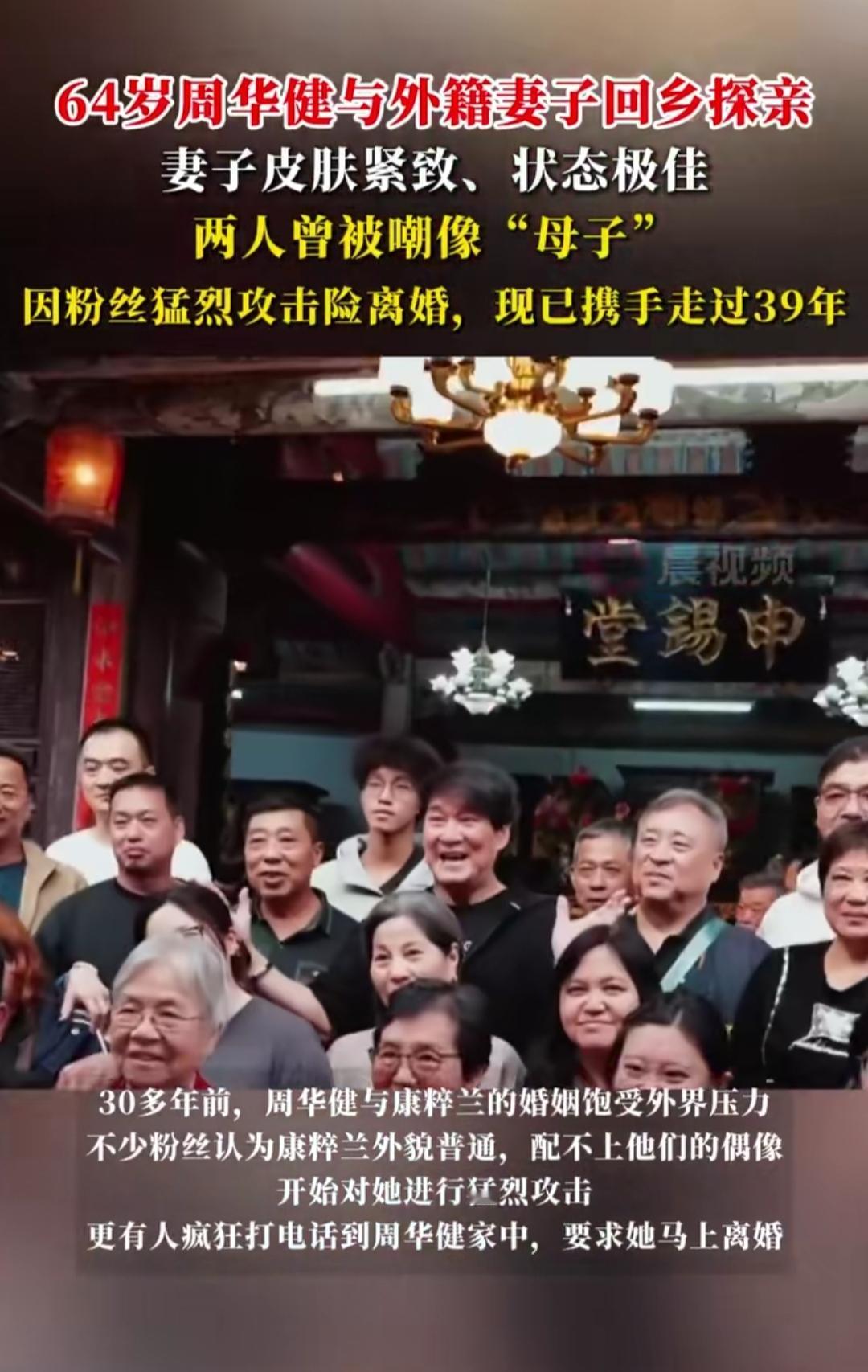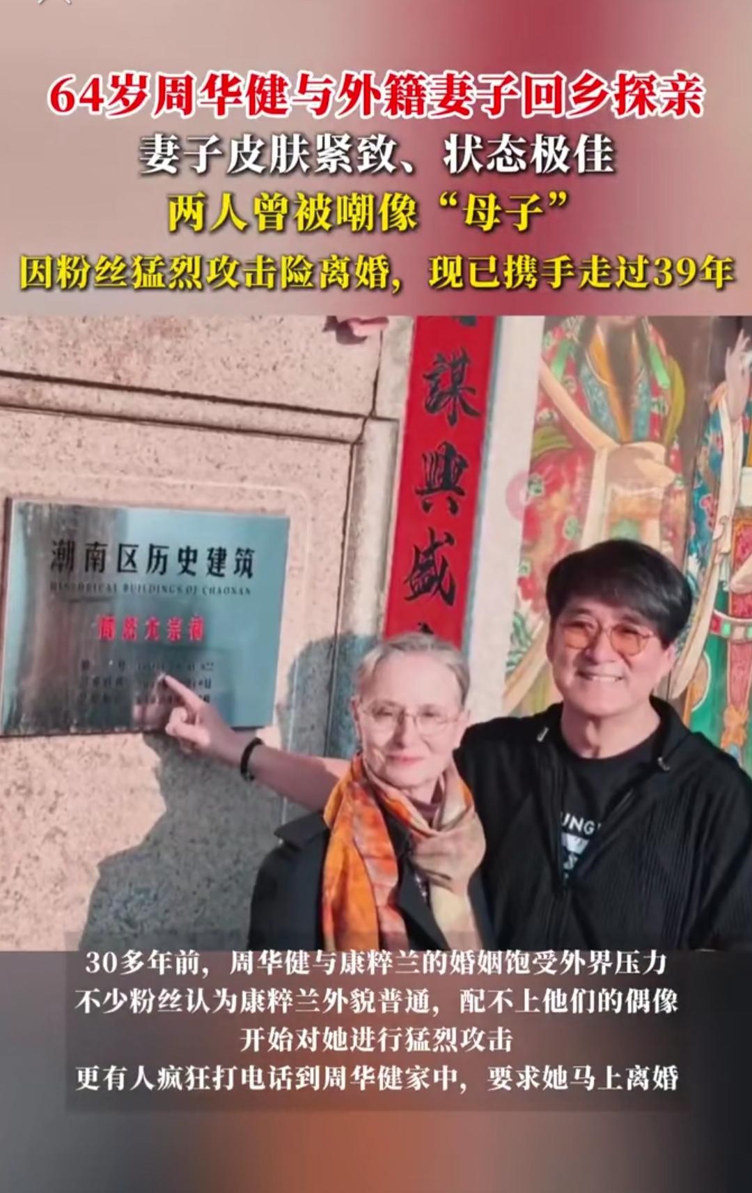 64岁周华健带外籍妻子回乡探亲,妻子状态好到皮肤紧致,可谁能想到,这对携手39年的夫妻,曾被粉丝骂到差点离婚。 当年周华健刚红,粉丝嫌康粹兰“配不上偶像”,嘲讽两人像“母子”,甚至疯狂打电话逼她离婚。可周华健偏不:他把妻子护在身后,说“她是我最重要的人”。 如今再看,那些曾被嘲笑的“不般配”,早被岁月熬成了最甜的陪伴。周华健笑着给妻子介绍老家的历史建筑,镜头里两人的默契,比任何情话都动人。 爱情哪有什么“标准答案”?扛过流言蜚语,把39年的烟火日子过成诗,这才是真正的“天作之合”。