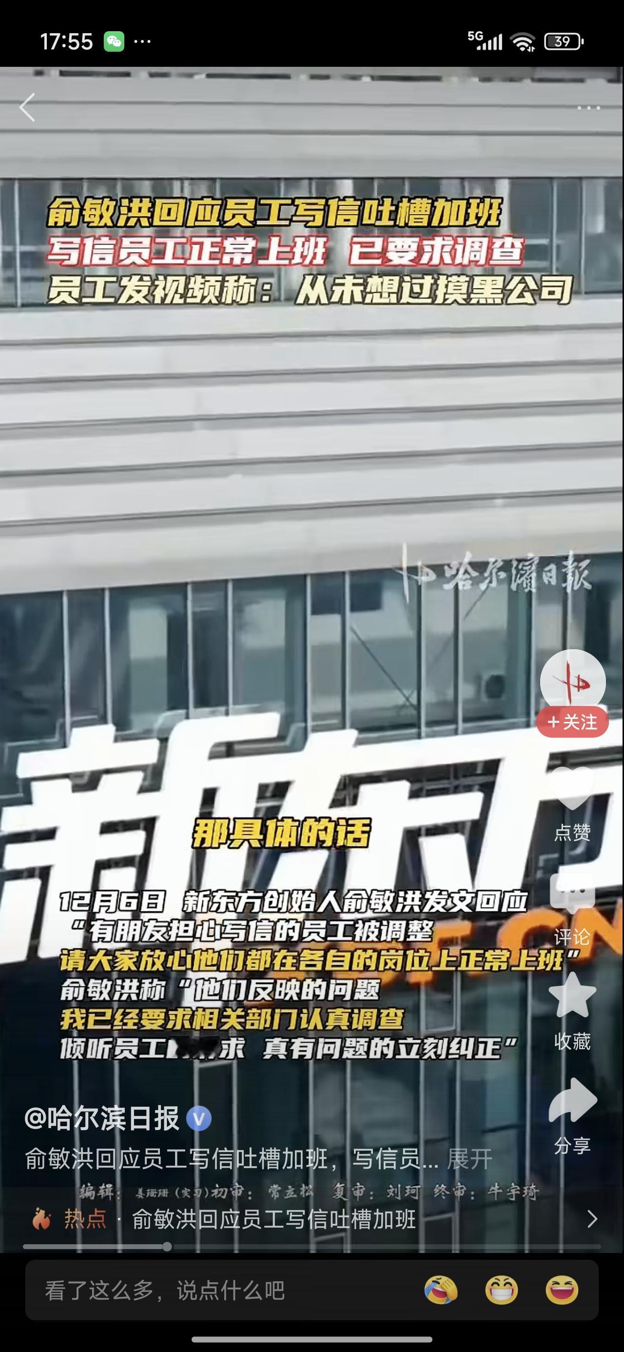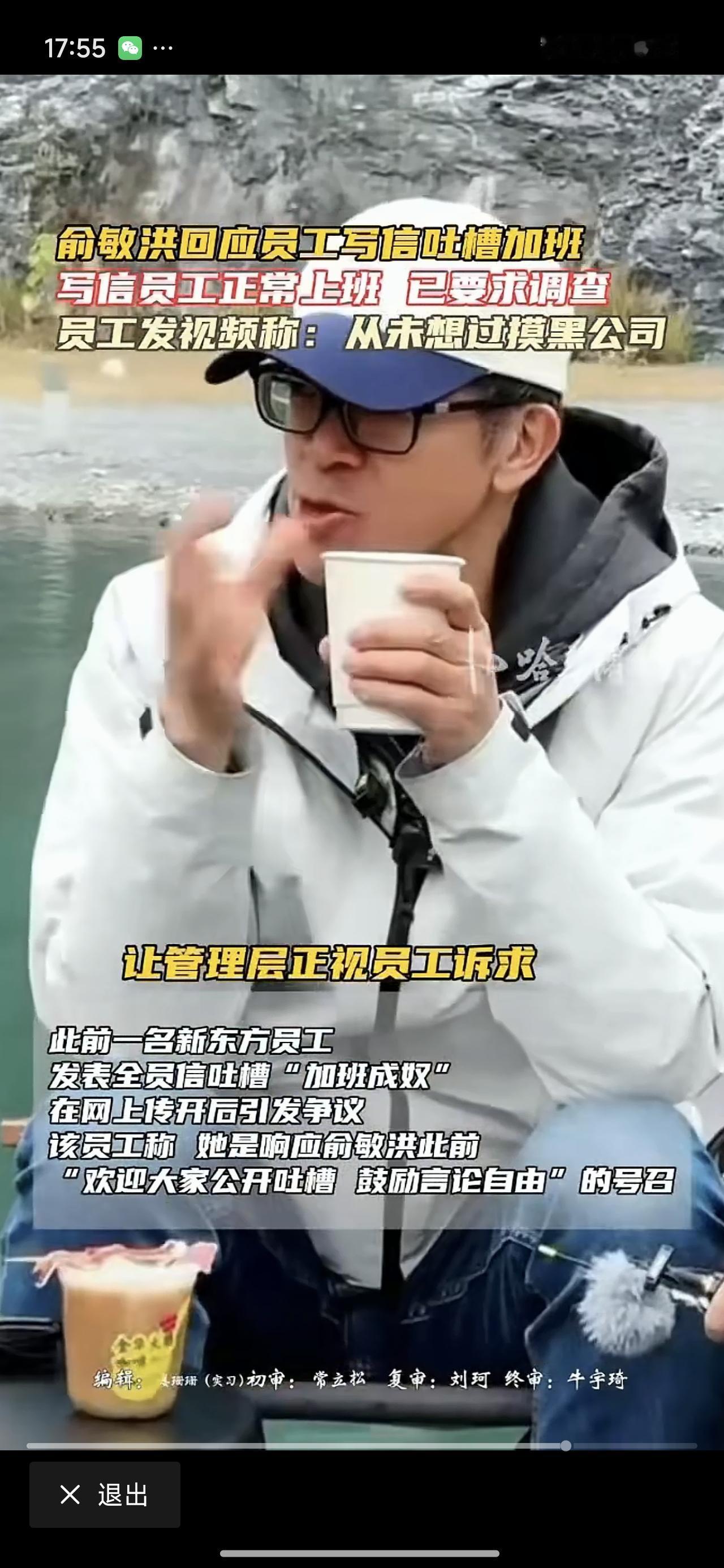新东方吐槽加班的员工出来证实了,仍然在职。也没有辞职的想法。 吐槽的目的是为了让管理层看到员工的诉求。正视员工的诉求。 新东方 咋说呢,你已经经历过一次风浪了,是对是错不重要了。诉求能不能得到解决。说白了,你认可这份工资你就干,不认可就走。 不是在教你做事,我没资格。你想想董宇辉,对吧!借钱买房子的销冠。你认为,你的影响力会比他大吗?他还不是一样的没有任何改观? 几千万的年薪照拿,但是不是他。此事热度过了,你依然还是一位优秀的老师。有一份稳定的工作。仅此而已。 希望你越来越好,但你在面对一个间歇性悲悯症的老板的时候,你只有把他的话当笑话听的份儿。你不可以当真。除非真金白银给到位了,才是真的有感谢员工付出。 很简单,一个公司,开起来,不压榨员工,难道压榨高管吗?压榨老板吗?逻辑上也不通啊?