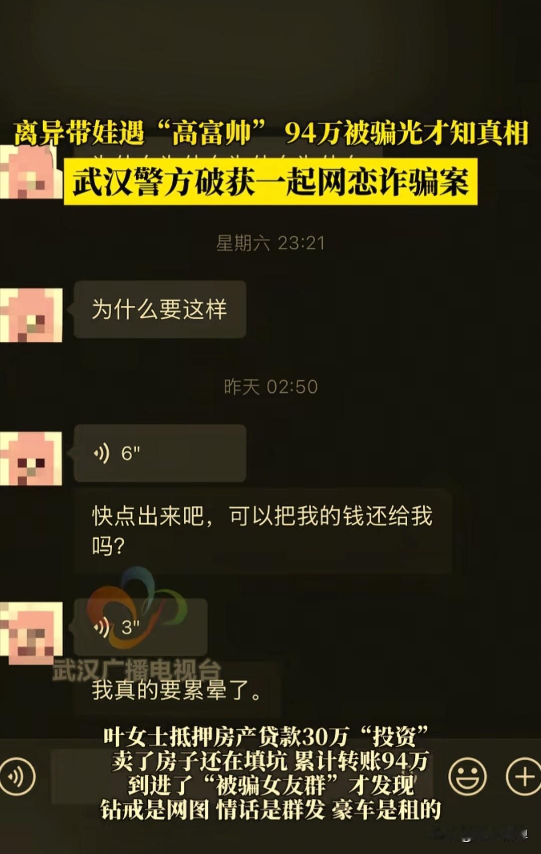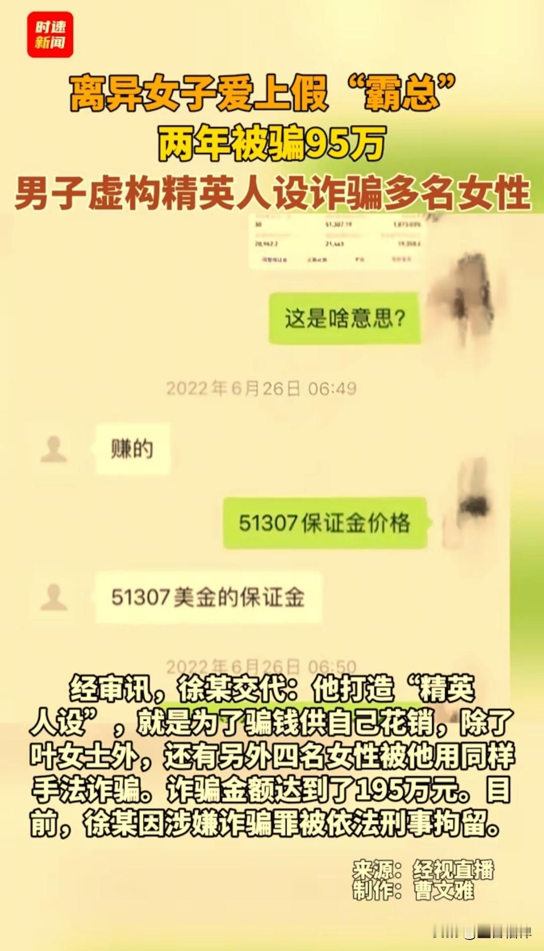 湖北武汉一39岁单亲妈妈叶女士,在网络上认识了一名高富帅男子,这名男子说他在国外留过学,是复旦大学金融系的毕业生,两人谈起了恋爱,结果叶女士三年被骗了94万元。 据多家媒体报道,武汉叶女士和这名叫徐某的男子在2021年在网上聊天相识,徐某说他30多岁,毕业于名牌大学,海外留过学,父母也是体制内的,他平时从事一些金融投资工作。 徐某住着别墅,平时穿着也是非常奢侈,穿的都是巴黎世家的牌子,出门也是开的宾利,这让叶女士彻底爱上了这个高富帅男朋友。 没多久徐某就找借口找叶女士借钱,说要送礼,股票操盘需要钱等理由,叶女士起初有点不愿意,但在徐某的甜言蜜语下,徐某说我会把你的儿子当自己的孩子。 叶女士彻底为爱情冲昏头脑,三年时间持续转账给了徐某94万元,叶女士也曾怀疑这徐某是不是个骗子,但是在徐某的甜言蜜语之下深陷其中。 徐某一直在骗取多名女子的钱财,用于酒吧挥霍、打赏主播和购买奢侈品。 因徐某经常借用朋友的支付宝账户收款,朋友觉得流水异常起了疑心,联系到其他受害者建群对账,这个骗局因此败露。 受害者一起报了警,徐某因诈骗罪被依法刑事拘留,据办案民警介绍,这是一起打着恋爱幌子的诈骗案。 目前报案女子有4人,被骗女子年龄从06年到86年,最小19岁,最大39岁,加起来的诈骗金额大概是158万左右。 徐某对受害者谎称自己30多岁,实际是98年的,真实年龄27岁,所谓海外留学和名牌大学经历也是假的,实际是中职毕业,别墅和豪车也是租的。 徐某因涉嫌诈骗罪,已于2025年10月22日被警方刑事拘留,截止2025年11月底,检察机关已批准对其逮捕,案件进入后续司法程序。 这类案件是典型的“杀猪盘”诈骗,对于声称“高富帅”“霸总”之类的陌生网友要保持警惕,对于他们说的所谓稳赚不赔的项目,不能轻易去投资。 任何以投资、周转或者有突发事件为由索要钱财的行为,都可能是诈骗,坚决不能随便向陌生账户转账。 诈骗分子会针对单身人士的情感需求提供“情绪价值”,目的就是为了建立信任后以便行骗。