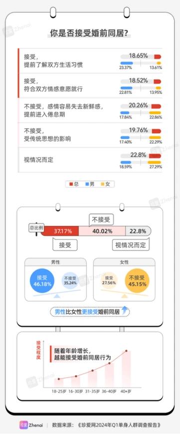 “婚前同居”男性女性谁的接受度更高 关于婚前同居的接受度调查 · 数据来源1:两颗红豆调查 (2025) · 男性接受度:88.16% · 女性接受度:74.35% · 主要结论:男生的接受度更为开放。 · 数据来源2:世纪佳缘报告 (2025) · 男性接受度:超80% · 女性接受度:未婚女性64%;离异女性77% · 主要结论:普遍来说,女性比男性更谨慎、接受程度更低。 · 数据来源3:珍爱网调研 · 总体接受度:近四成受访者接受。 · 主要结论:当代青年在理性判断与现实权衡之间不断调整。 支持者怎么看:从“试婚”到现实考量 无论是男性还是女性支持者,他们的理由已经超越了“摆脱贞操观念”,更多是基于现实生活的理性考量。 · 核心诉求:降低婚姻试错成本 许多支持者将同居视为重要的“试婚”阶段,认为共同生活能直观地暴露双方在生活习惯、消费观念、家务分工上的差异。在决定走入法律婚姻前,提前磨合这些现实问题,被认为是对自己和关系更负责任的做法。甚至一些有过失败婚姻经历的离异人群,会更看重婚前同居的必要性。 · 关系发展的自然阶段 在部分人看来,当感情发展到一定深度,希望有更紧密的联结和更深入的了解时,同居成为一种“水到渠成”的选择。他们认为,这有助于建立稳定的感情基础。 · 女性支持者的现实动机 现代女性支持同居,部分确实源于对传统贞操观的反思。但这种反思并不仅仅是为了“免除愧疚感”,其背后更深层的诉求是争取平等的身体自主权和婚恋选择权。她们希望在两性关系中,自己的价值不取决于所谓的“贞洁”,而在于个人本身。 反对者的忧虑:不止于“婚前性行为” 反对婚前同居的观点同样多元,并不仅局限于道德批判。 · 对女性权益的现实担忧 有观点明确指出,在同居关系中,女性可能承担更多情感成本和家务劳动,而在关系破裂时,社会对女性的评价往往更为严苛,这可能让女性处于不利地位。 · 对关系本身的损耗 一部分人担心,过早进入日常琐碎的生活会加速消耗恋爱的激情和新鲜感。也有人非常看重个人独立的私人空间,认为同居会破坏这种边界感。 法律与社会的现实张力 无论个人如何选择,整个社会对于非婚同居的认知正在发生复杂的变化。 · 法律保护范围的扩大 一个重要的新动态是,中国最高检明确,将 “具有共同生活基础事实的婚前同居关系”认定为家庭成员关系,此举旨在将反家暴的保护范围覆盖到同居伴侣。这从法律层面承认了某些同居关系的紧密性与事实性。 · 根深蒂固的社会观念 然而,法律层面的进步并不能立即消除社会观念的压力。“处女膜修复术”现象,正说明了在婚恋市场中,陈旧的“贞操”观念依然具有现实影响力。这种压力使得一些女性陷入矛盾:一方面倡导身体自主,另一方面又不得不面对潜在配偶可能存在的保守观念。 总结 关于婚前同居的讨论,已不能简单用“男性更开放”或“女性更支持”来概括。数据显示,整体上男性的接受度更高,但无论支持还是反对,两性的理由都日益趋向理性和现实。 其背后反映的,是传统观念与现代个体诉求之间的持续碰撞。女性在这一议题上的复杂态度——既想摆脱物化审视,又无法完全忽视现实婚恋市场的压力,正是这种碰撞的集中体现。最终,同居与否没有标准答案,关键在于伴侣双方能否就此进行坦诚沟通,并达成尊重彼此节奏和底线的一致共识。