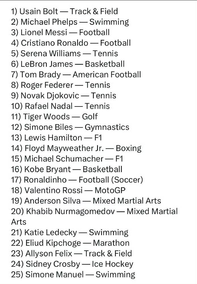 ChatGPT 评选出 21 世纪体坛最伟大的 25 名运动员,这个前十名名单你们认可吗?1. 博尔特 (Usain Bolt) - 田径2. 菲尔普斯 (Michael Phelps) - 游泳3. 梅西 (Lionel Messi) - 足球4. C 罗 (Cristiano Ronaldo) - 足球5. 小威 (Serena Williams) - 网球6. 詹姆斯 (LeBron James) - 篮球7. 布雷迪 (Tom Brady) - 美式足球8. 费德勒 (Roger Federer) - 网球9. 德约科维奇 (Novak Djokovic) - 网球10. 纳达尔 (Rafael Nadal) - 网球