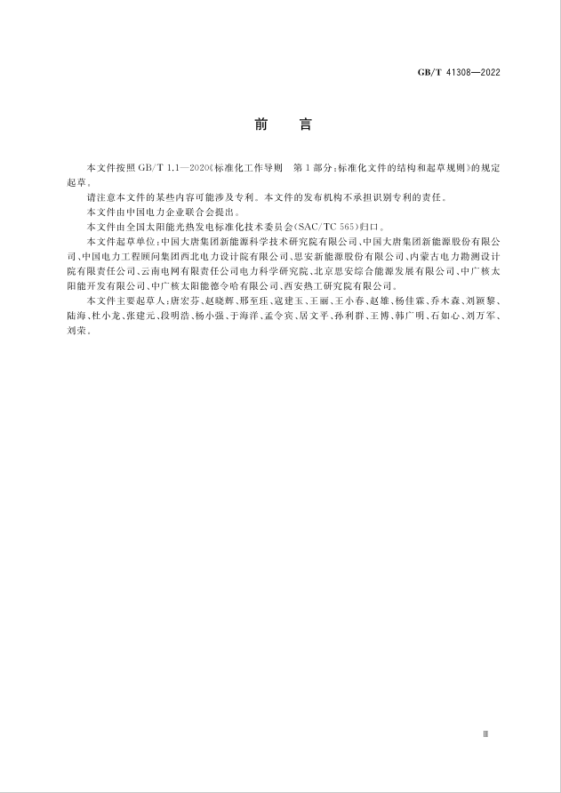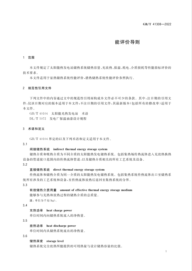 国家标准《太阳能热发电站储热系统性能评价导则》,编号GB/T41308-2022,由全国太阳能光热发电标准化技术委员会归口,自2022年10月1日起实施。