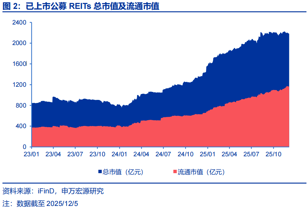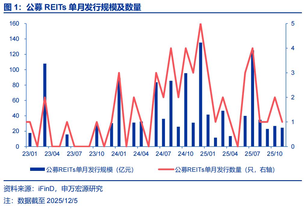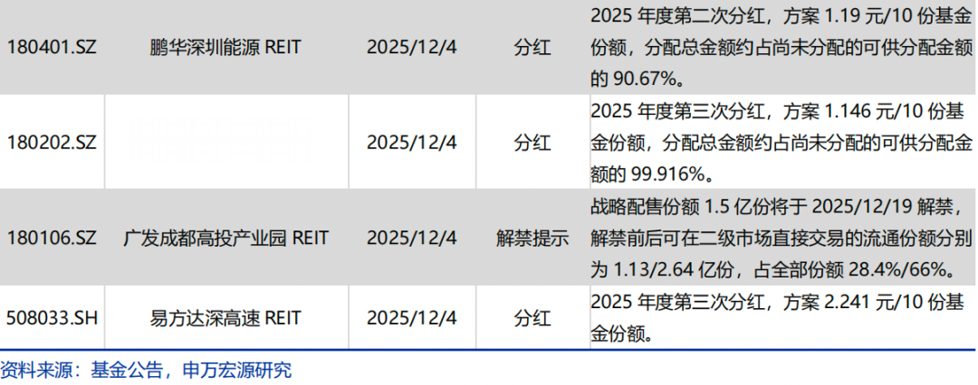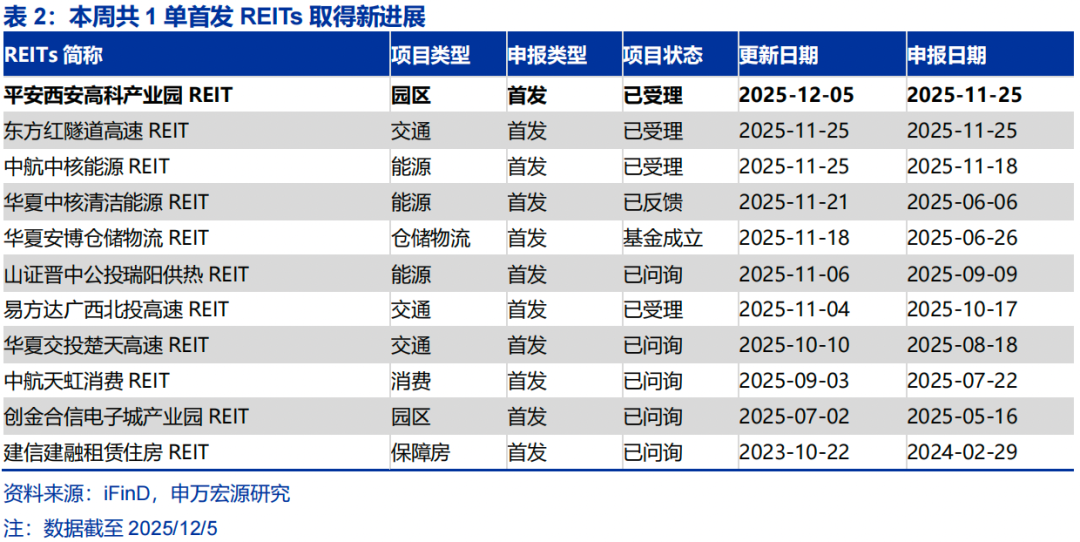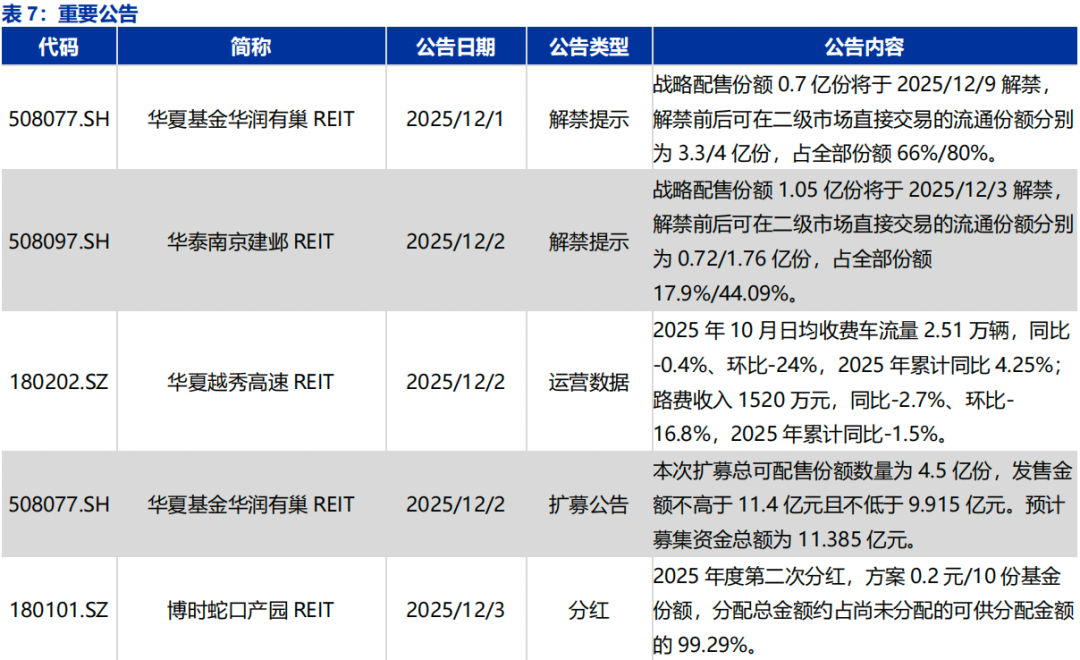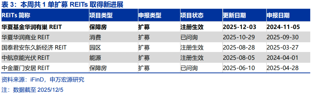 一级市场:截至2025/12/5,今年以来已成功发行19单(25Q1发行6单、25Q2发行4单、25Q3发行6单、10月发行2单、11月发行1单);发行规模387.9亿元、同比下降35.8%。本周共1单首发公募REITs取得新进展:平安西安高科产业园REIT已受理,底层资产为西安高新区软件新城,评估价值13.6亿元。本周共1单扩募公募REITs取得新进展:华夏基金华润有巢REIT扩募份额发售,采用向原持有人配售的方式(市场首单采用向原持有人配售方式的扩募),预计募集资金总额为11.385亿元。当前审批流程中REITs:(1)已申报11只,已问询并反馈2只,通过审核1只,注册生效待上市1只。(2)扩募:已申报5只,已问询并反馈3只,通过审核3只。