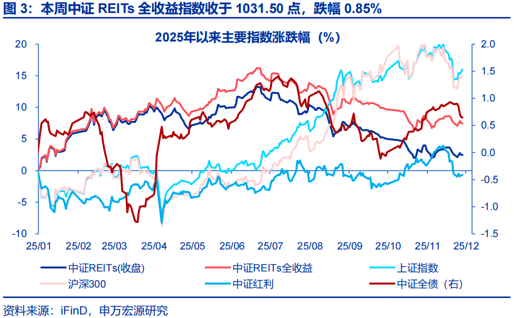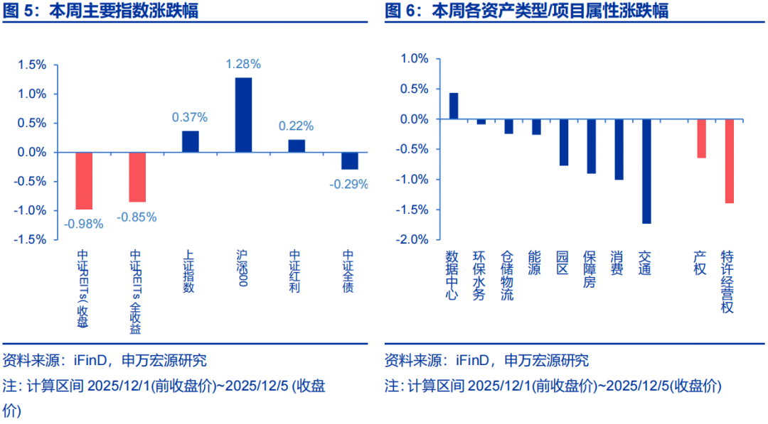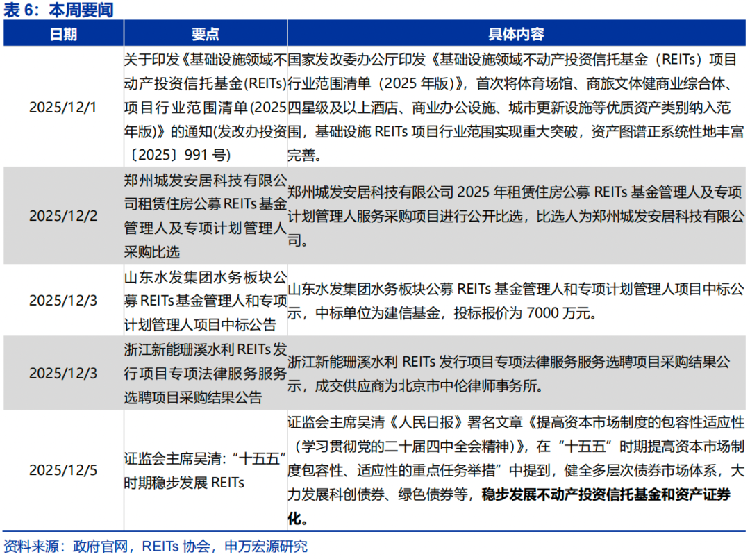 城市更新设施、高端酒店等纳入基础设施REITs申报!本周债市大幅调整,REITs市场整体承压,仅周三短暂修复,其余四个交易日持续走低,流动性明显收缩。各板块普跌,唯数据中心逆势收涨。本周“国产GPU第一股”摩尔线程上市大涨、第二股沐曦股份开始申购,算力概念持续发酵下,数据中心资产兼具稳定性与成长性,仍具有较大潜力。政策面继续突破,本周一,国家发改委办公厅印发《基础设施领域不动产投资信托基金(REITs)项目行业范围清单(2025年版)》,首次将体育场馆、商旅文体健商业综合体、酒店、商业办公设施、城市更新设施纳入申报范围,相较于上周证监会提出的商业不动产REITs(尚未明确申报要求),此次基础设施REITs扩围对传统商业地产提出了更具体的准入标准:四星级及以上酒店,超大特大城市的超甲级、甲级商务楼宇项目,延续了基础设施REITs服务国家战略、“稳中求进”的发展思路。此外,证监会吴清主席在《人民日报》发表署名文章,进一步强调“十五五”时期将稳步发展REITs,为行业发展注入信心。