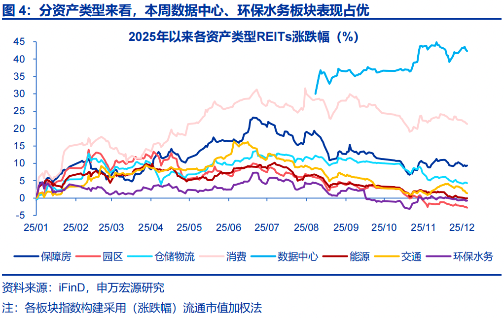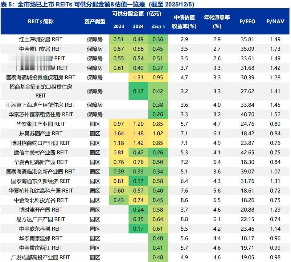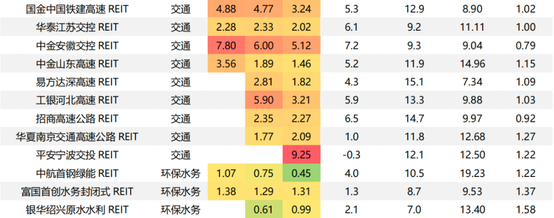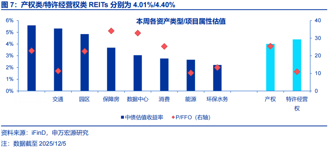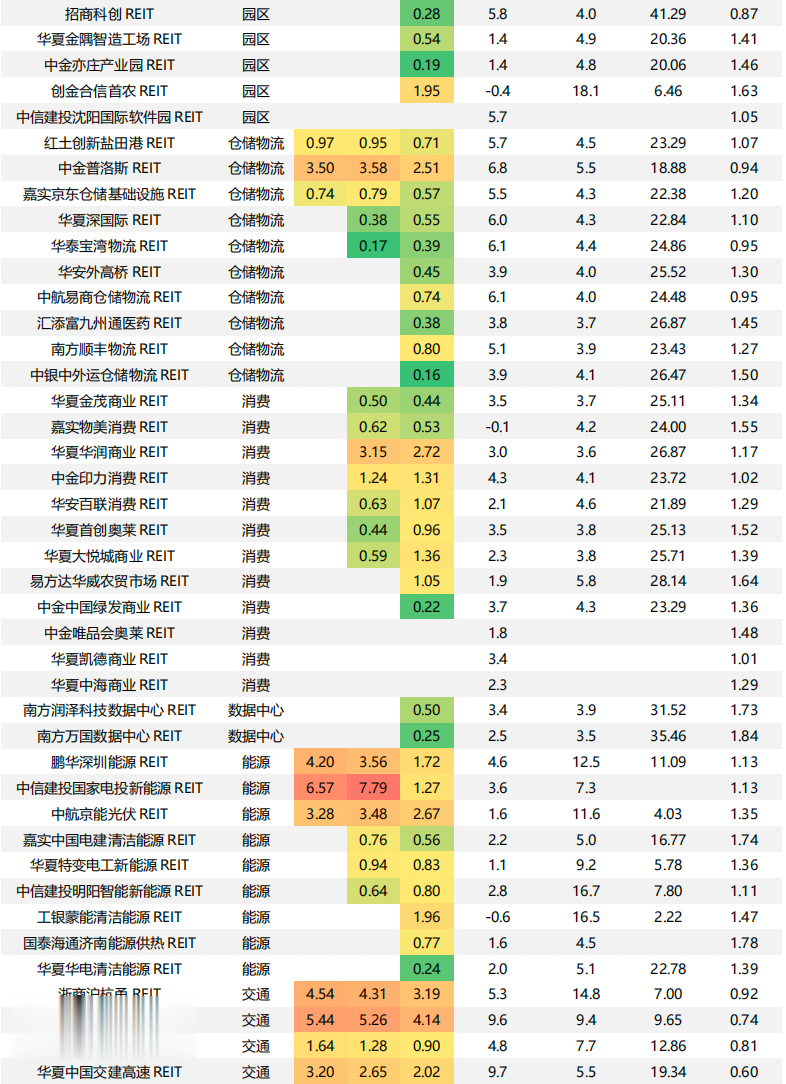 估值:从中债估值收益率来看,产权类/特许经营权类REITs分别为4.01%/4.40%,仓储物流(5.59%)、交通(5.32%)、园区(4.85%)板块位列前三。
