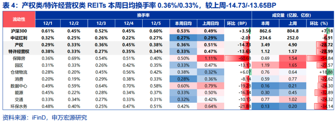 流动性:产权类/特许经营权类REITs本周日均换手率0.36%/0.33%,较上周-14.73/-13.65BP,周内成交量3.49/1.12亿份,周环比-28.72%/-28.99%。数据中心板块活跃度最高。