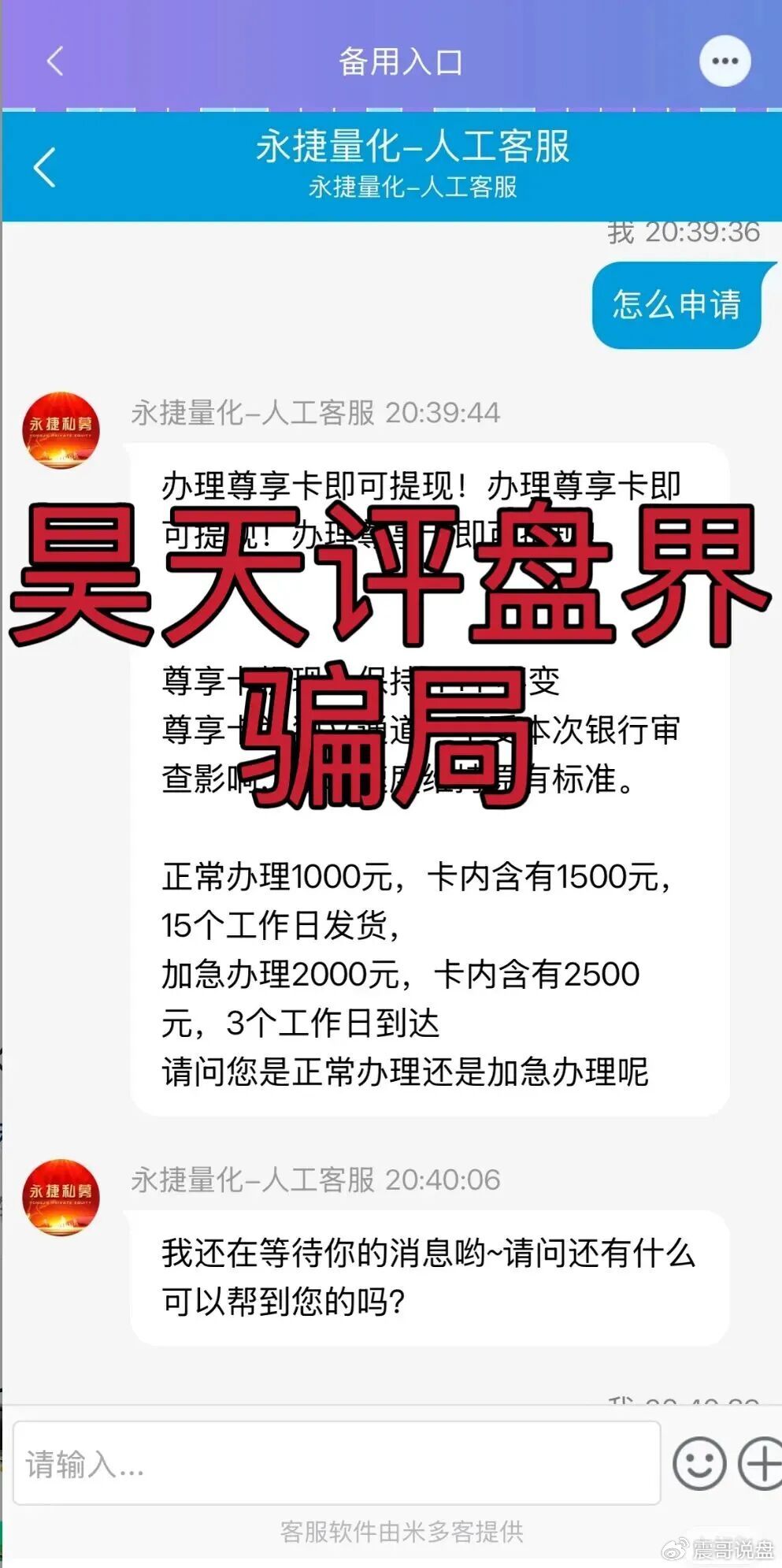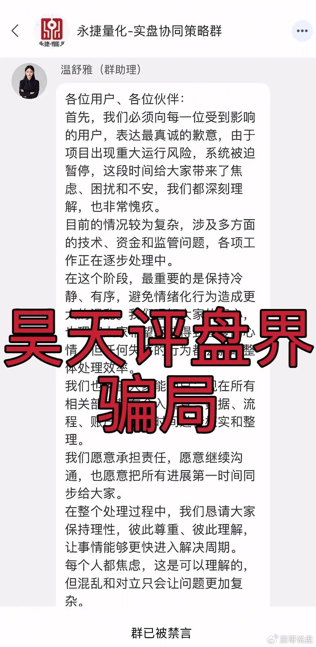 永捷量化(永捷私募)股票跟单类资金盘骗局,震哥之前预警了多次了,昨日正式发公告崩盘跑路了,二次收割开始,因为有的上级给会员承诺亏损了“包赔”,已有受害者去上级家里维权从上级那里拿回了血汗钱,而对于其他受害者震哥建议只能报警!崩盘公告如下:各位用户、各位伙伴:首先,我们必须向每一位受到影响的用户,表达最真诚的款意,由于项目出现重大运行风险,系统被迫暂停,这段时间给大家带来了焦虑、困扰和不安,我们都深刻理解,也非常愧疚。目前的情况较为复杂,涉及多方面的技术、资金和监管问题,各项工作正在逐步处理中。在这个阶段,最重要的是保持冷静、有序,避免情绪化行为造成更大的混乱。我们理解大家的担心,也理解大家希望尽快得到答复的心情,但任何失序的行为都会影响整体处理效率。我们也希望大家能明白:现在所有相关部门都在介入排查,数据、流程、账户都需要时间进行核实和整理。我们愿意承担责任,愿意继续沟通,也愿意把所有进展第一时间同步给大家。在整个处理过程中,我们恳请大家保持理性,彼此尊重、彼此理解,让事情能够更快进入解决周期。每个人都焦虑,这是可以理解的,但混乱和对立只会让问题更加复杂!