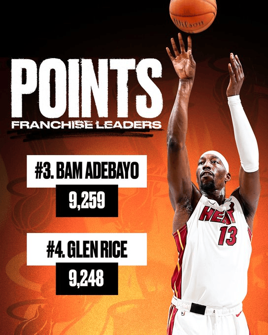 赛后,热火官方晒出海报,庆祝阿德巴约升至队史得分榜第三位。