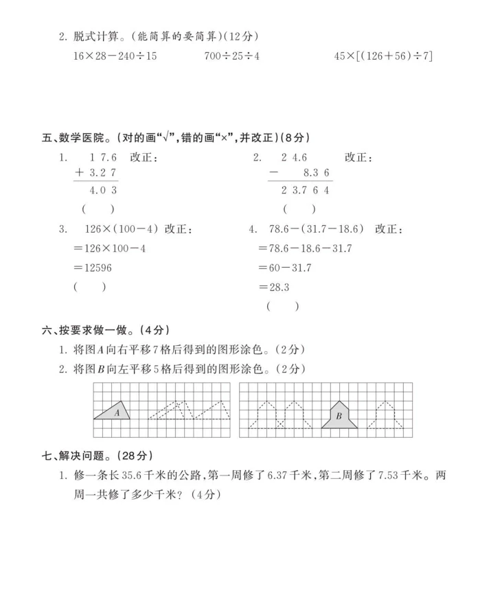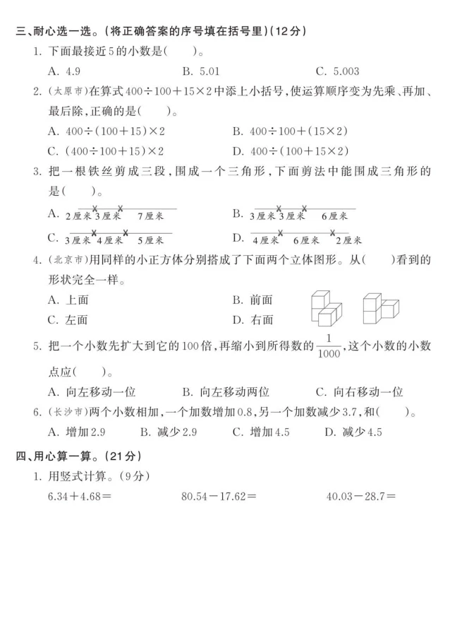 易混易错题四年级下册数学