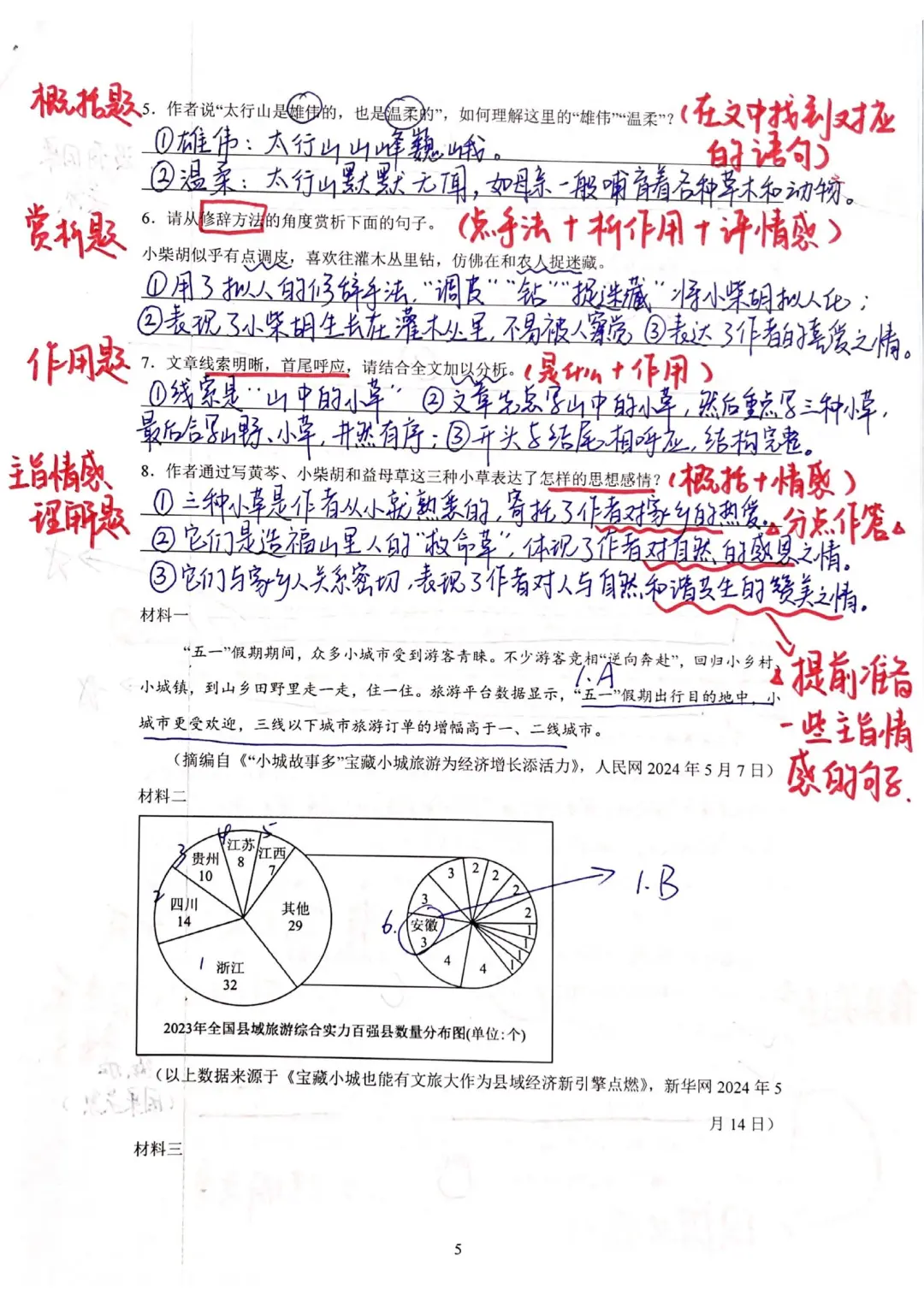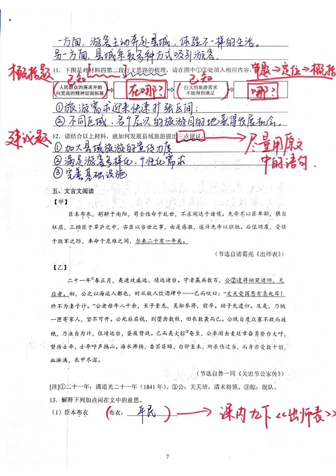 9.阅读题中的主旨情感题快速作答:学课内文章时要背诵并总结主旨情感句,考场上直接在自己背过的主旨情感句中选择合适的句子答题,能节省组织语言的时间。