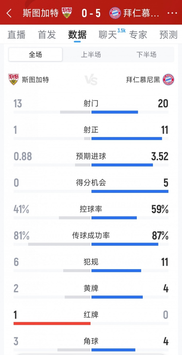 直播吧12月7日讯在本轮德甲,拜仁5-0大胜斯图加特,以下为双方全场数据对比: