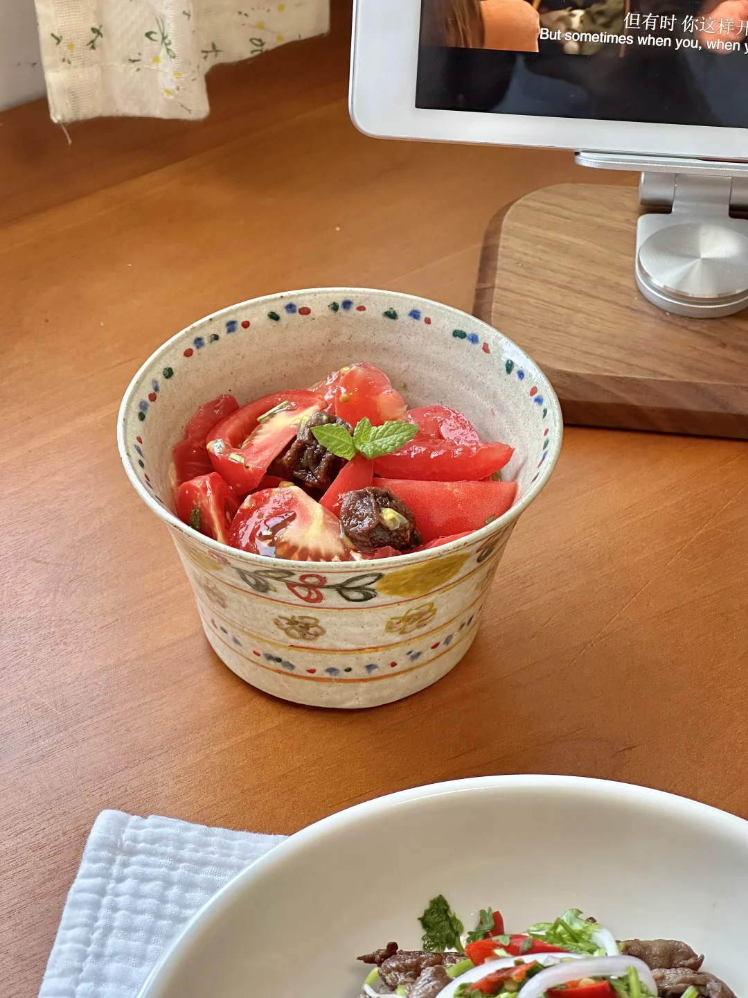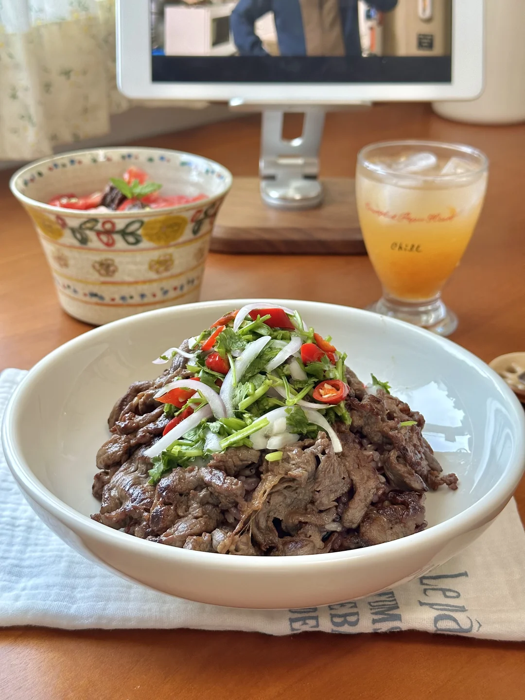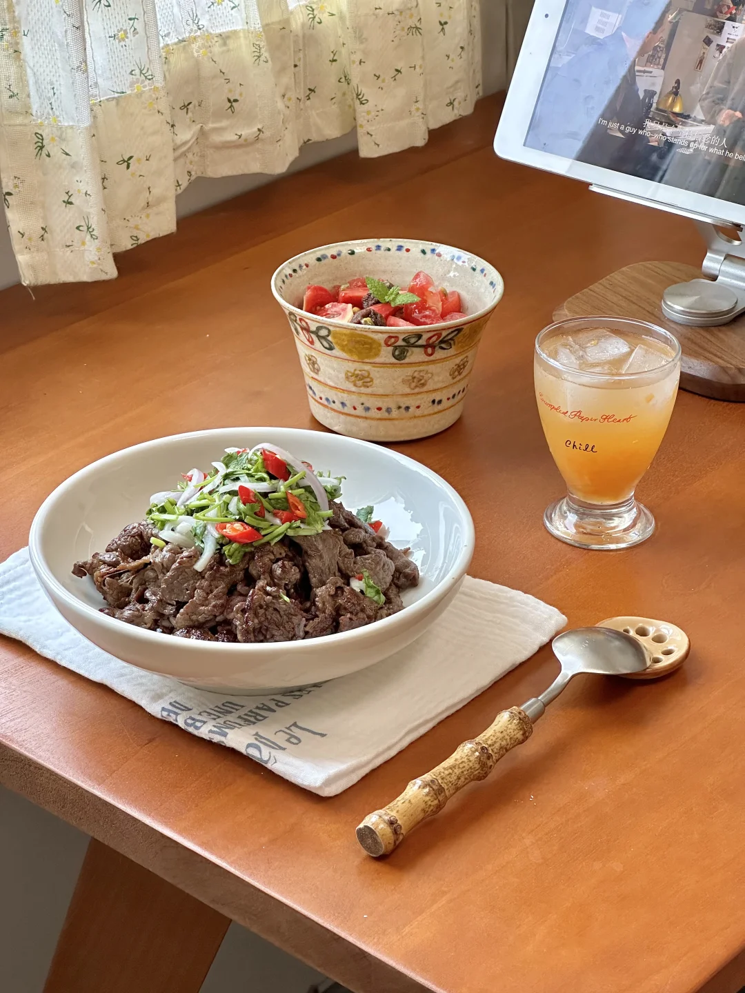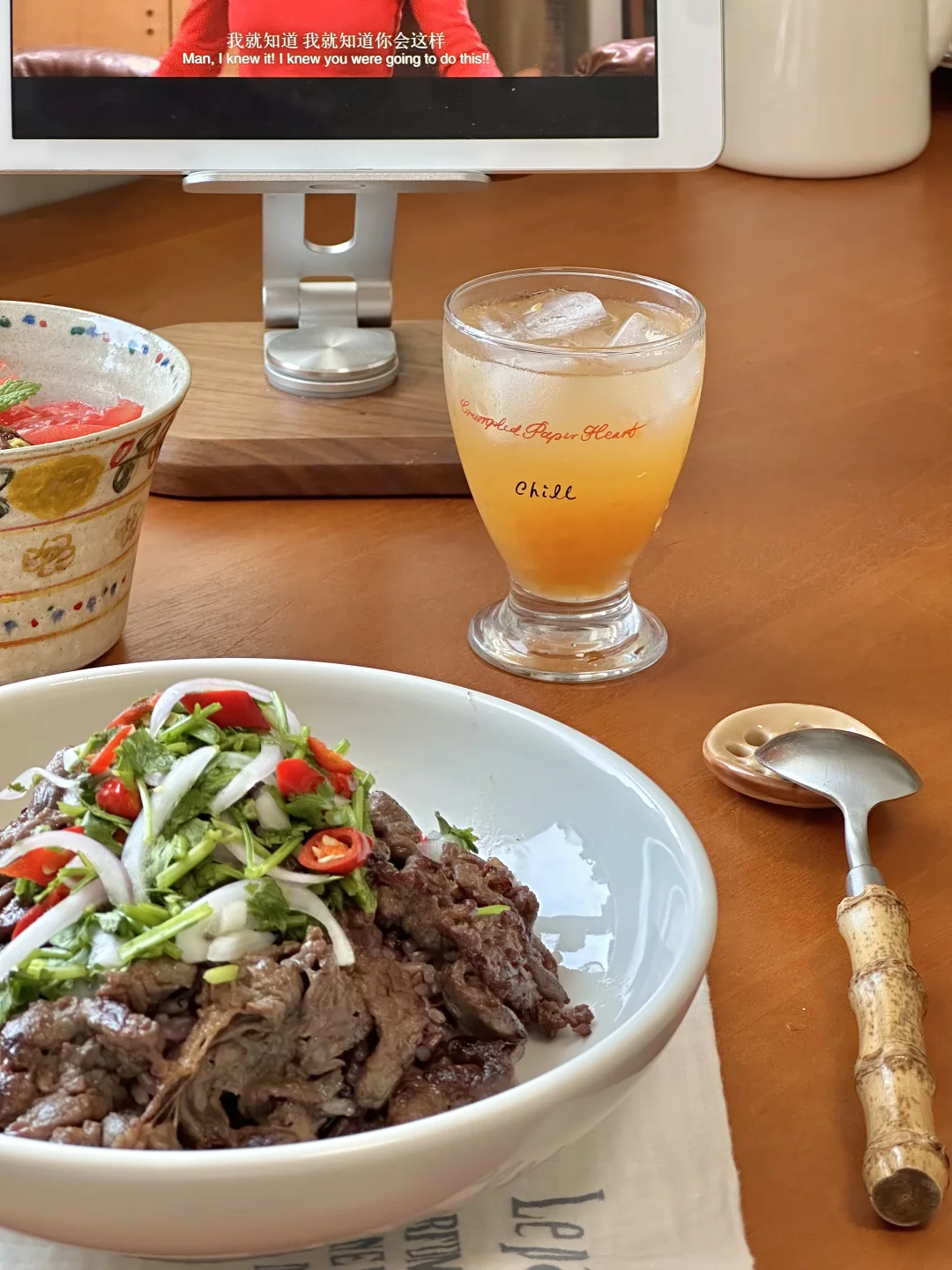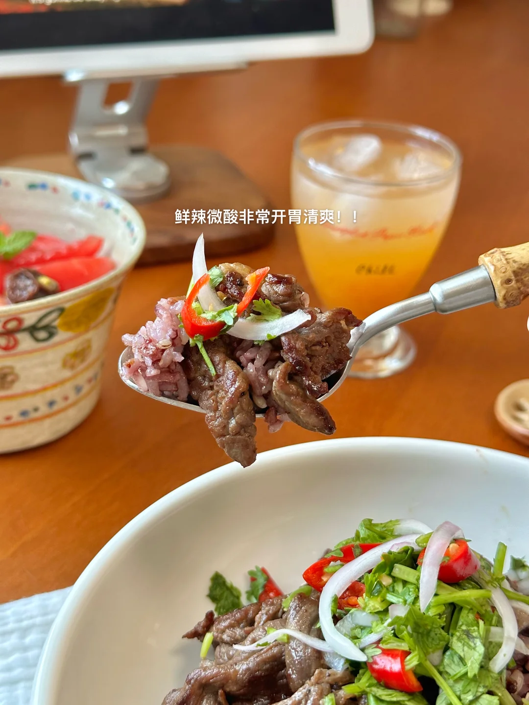 🥄今日菜单: 泰式酸辣火山牛肉饭 百香果话梅渍番茄 红杏冰茶 . 详细做法步骤图往后翻~ . 夏天没有什么胃口 还是吃点酸酸辣辣的泰式风味更有食欲~ 牛肉片拌上料汁是很清爽的口感 还特意配了杂粮饭嘿嘿😙 夏天喜欢吃冰镇的渍番茄 不加其他东西只放一点糖也很多汁解腻~ 红杏冰茶是买的 个人感觉多加冰块更好喝 .
