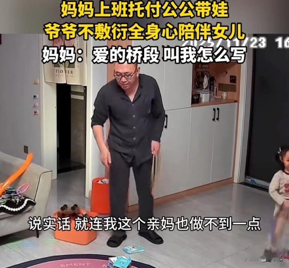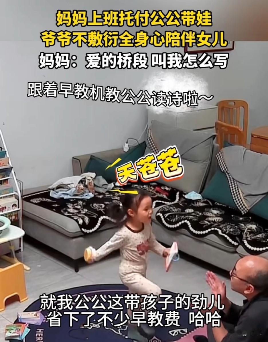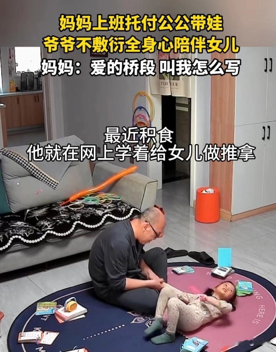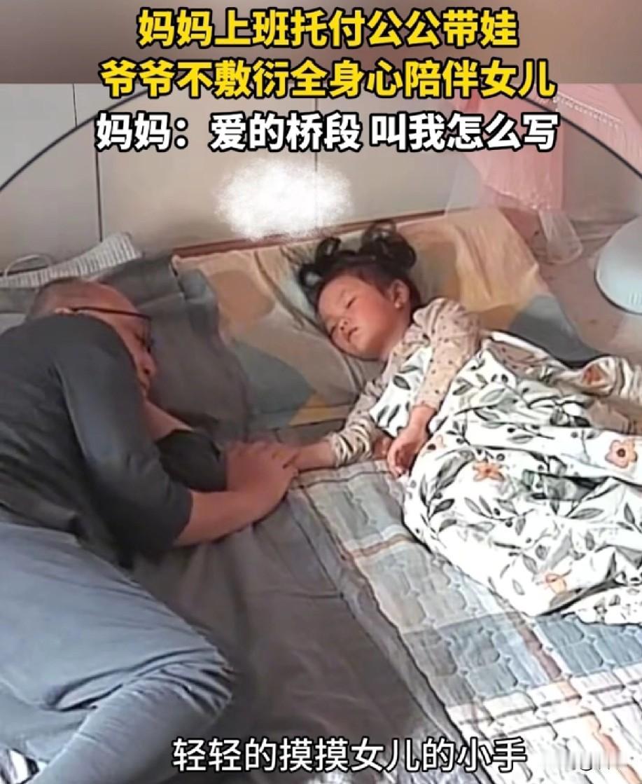 山西一妈妈上班托付公公带娃,爷爷不敷衍全身心陪伴孙女,高质量陪伴孙女,真是全网最好的爷爷。 首先,边界感很足。爷爷见孙女在睡觉,上床前先铺了毯子再躺在孙女旁边。 其次,很细心。手一直牵着孙女小手,深怕有事情自己第一时间没发现。起床后跟孙女一起把床单叠好,床上也收拾好。喂孙女喝水,补充水分。 接着,高质量陪伴。陪孩子学英语,背古诗,玩。不会为了轻松,就让孙女看电视玩手机。亲妈直言都不会说到如此高质量陪伴。 最后,孙女累了,躺地毯上休息。爷爷就跟着网上学着给孙女做推拿,怕孙女积食。 爷爷是一刻也不歇着,高质量陪伴,既有边界感,又有分寸感,更有责任感。真心换真心,孙女感受到爷爷的关心,跟爷爷很亲近,很喜欢爷爷。 真心实意对孩子好的公婆可遇不可求,而女子是幸运的,遇到一个好公公,让孩子出生在一个好的原生家庭。