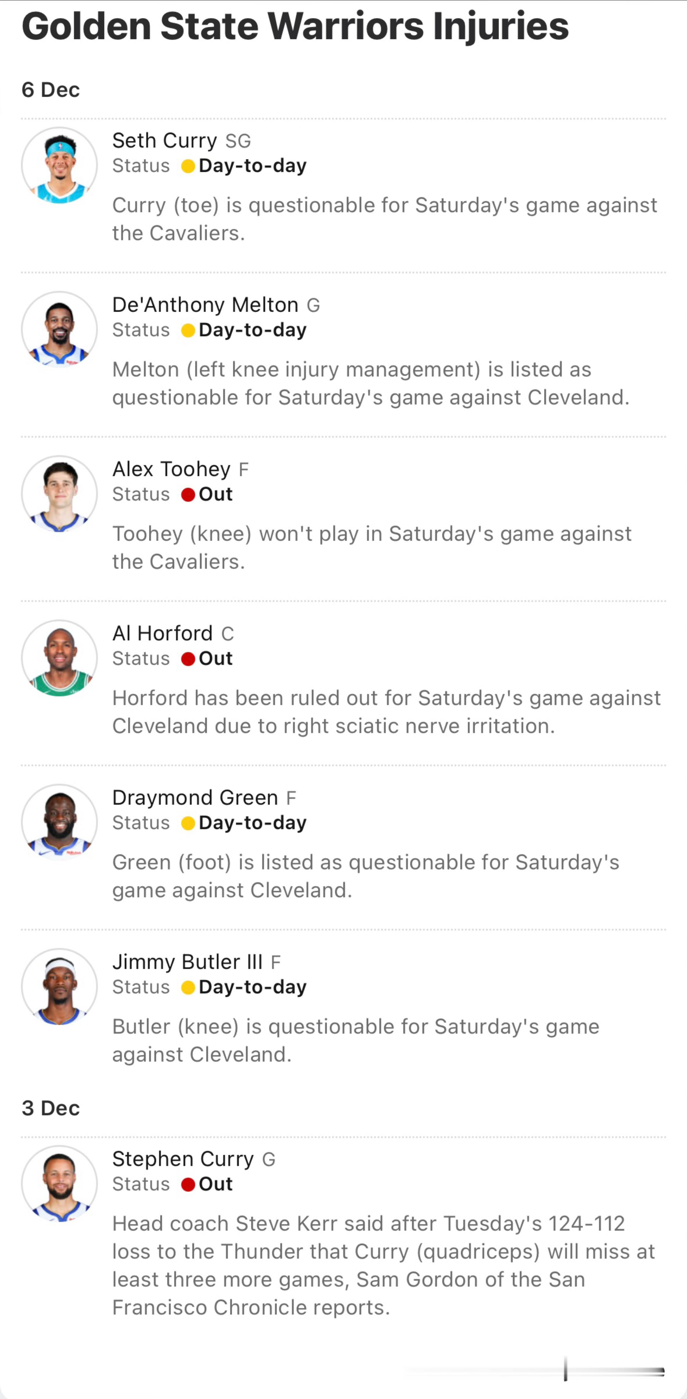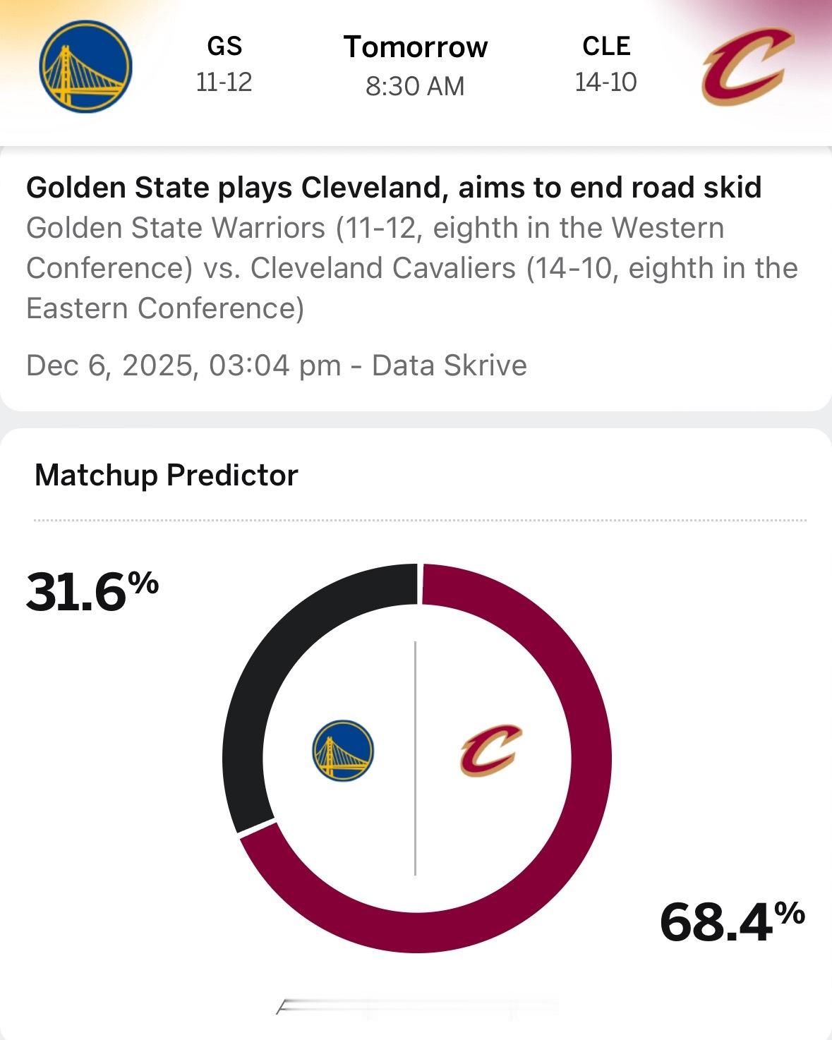明日骑勇大战再度来袭,ESPN给出获胜概率:勇士31.6%、骑士68.4%。斯蒂芬-库里、霍福德缺席比赛,巴特勒、格林、梅尔顿、塞思-库里出战存疑。骑士背靠背出战,伤病报告暂时没有。当前指数,骑士主场-7.5勇士vs骑士